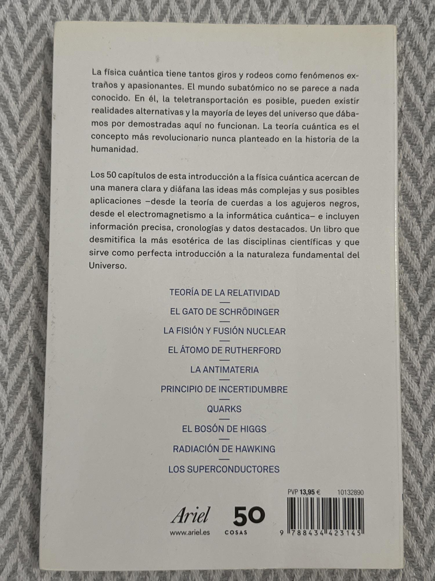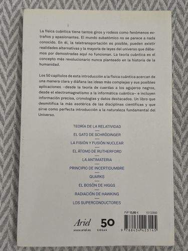 El libro presenta cincuenta conceptos clave de la física cuántica explicados de forma breve y accesible, desde partículas subatómicas hasta principios como la superposición o el entrelazamiento. Cada sección introduce una idea fundamental sin necesidad de conocimientos avanzados. Es una obra divulgativa que ofrece una visión clara y estructurada de la mecánica cuántica.