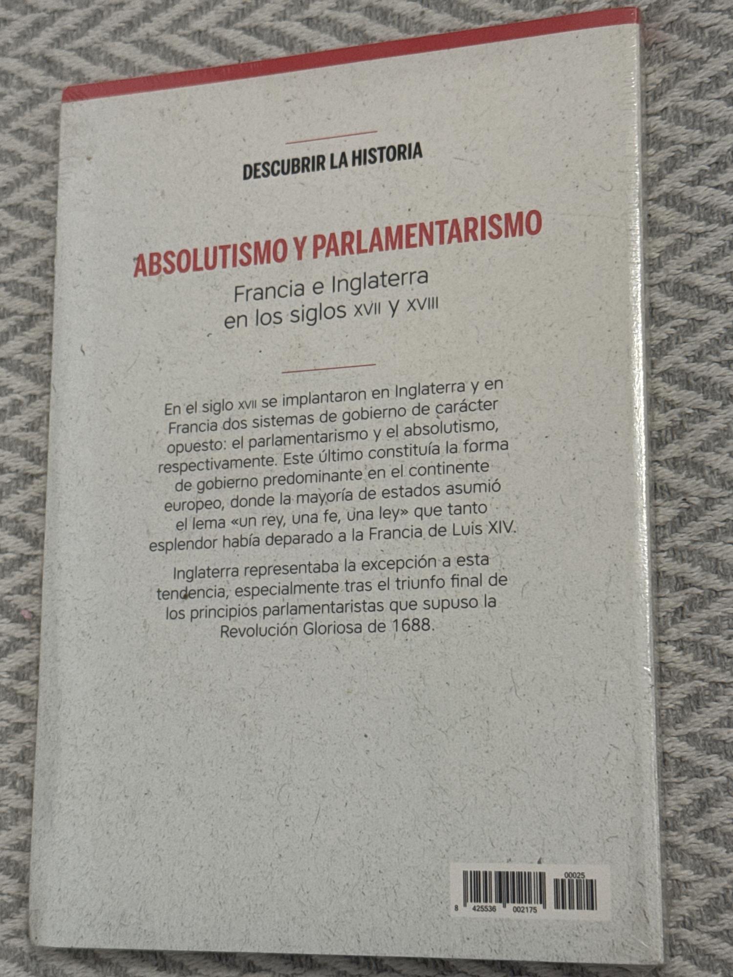 Absolutismo y parlamentarismo: Francia e Inglaterra en los siglos XVII y XVIII es una obra de divulgación histórica que analiza los distintos modelos políticos desarrollados en Europa durante la Edad Moderna. El libro compara el absolutismo monárquico francés con la evolución del sistema parlamentario inglés, explicando los cambios institucionales, sociales y políticos de los siglos XVII y XVIII.