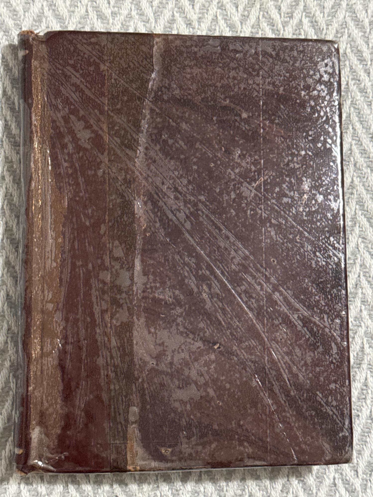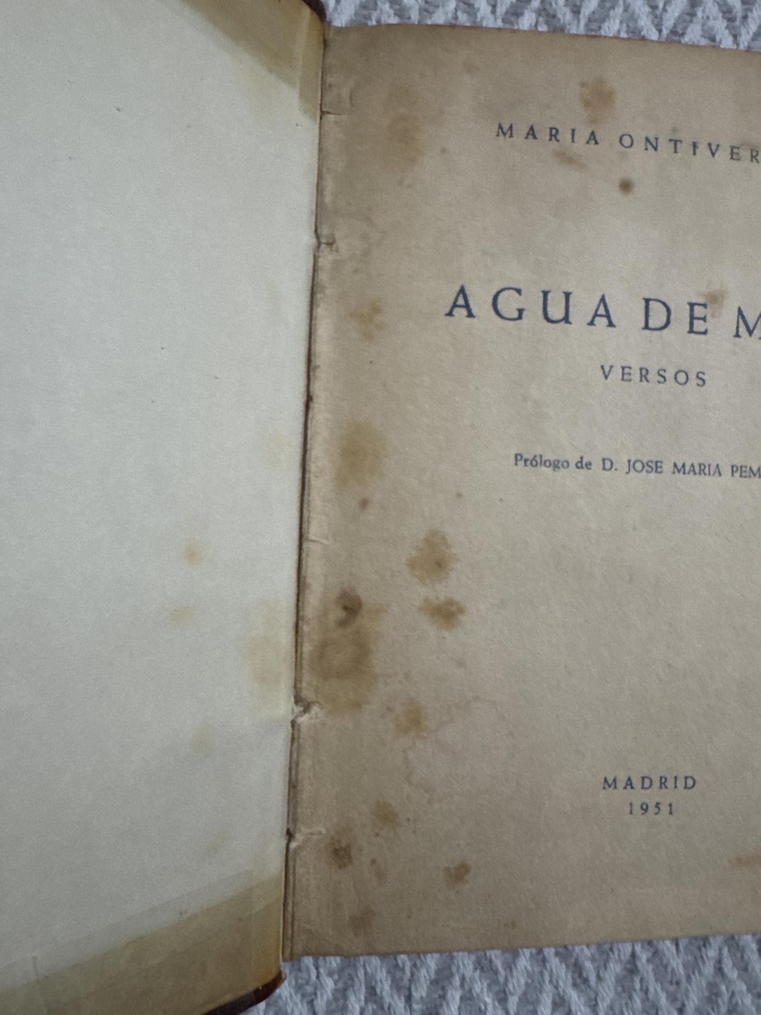 Hojas amarillentas y parcialmente manchadas. Contiene un mensaje dedicatorio y firma de la autora