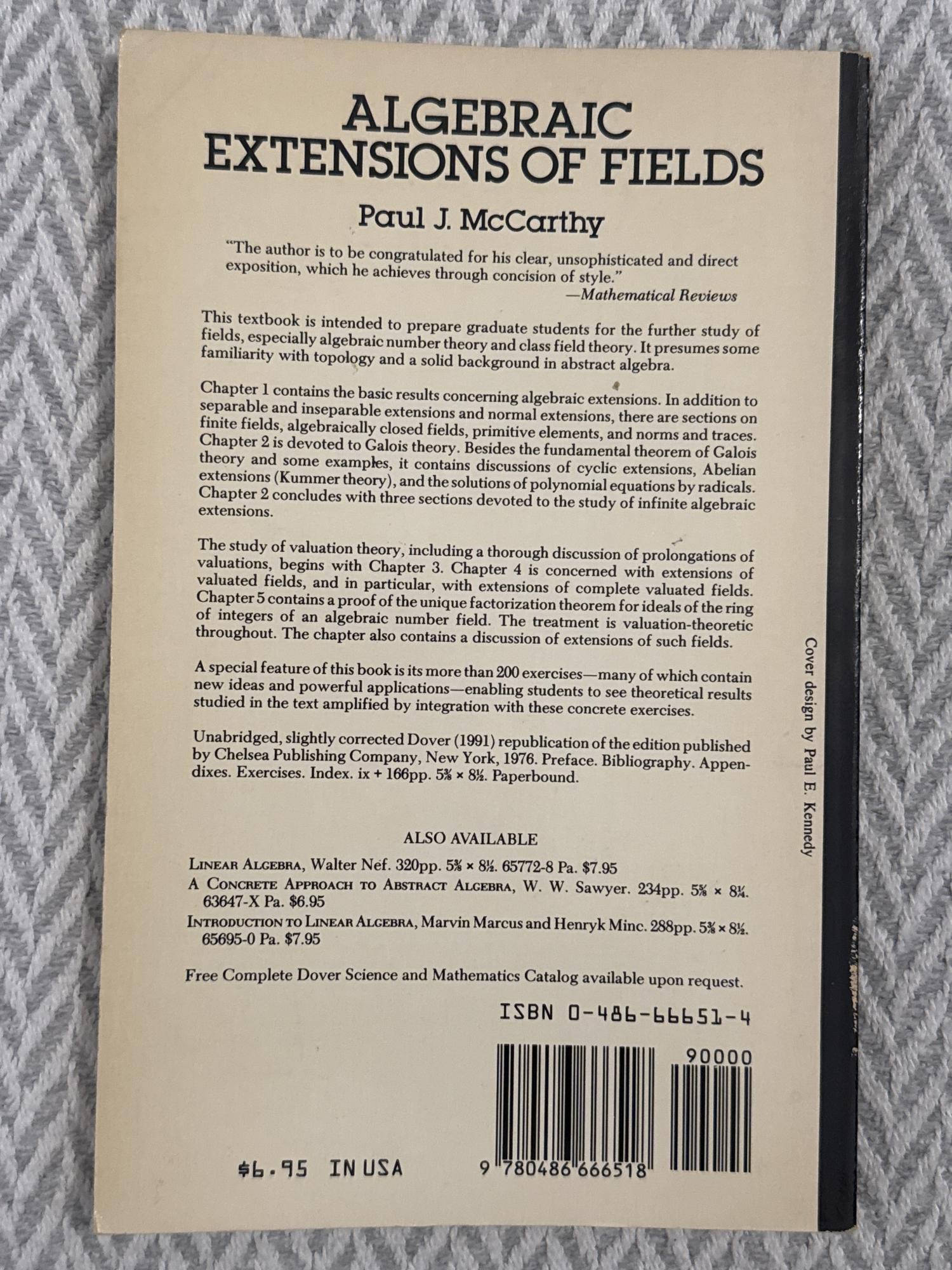 El libro estudia las extensiones algebraicas de cuerpos, abordando conceptos como polinomios irreducibles, grados de extensión y clausura algebraica. Desarrolla resultados fundamentales que conectan con la teoría de Galois. Es una obra teórica orientada a estudiantes avanzados de álgebra.