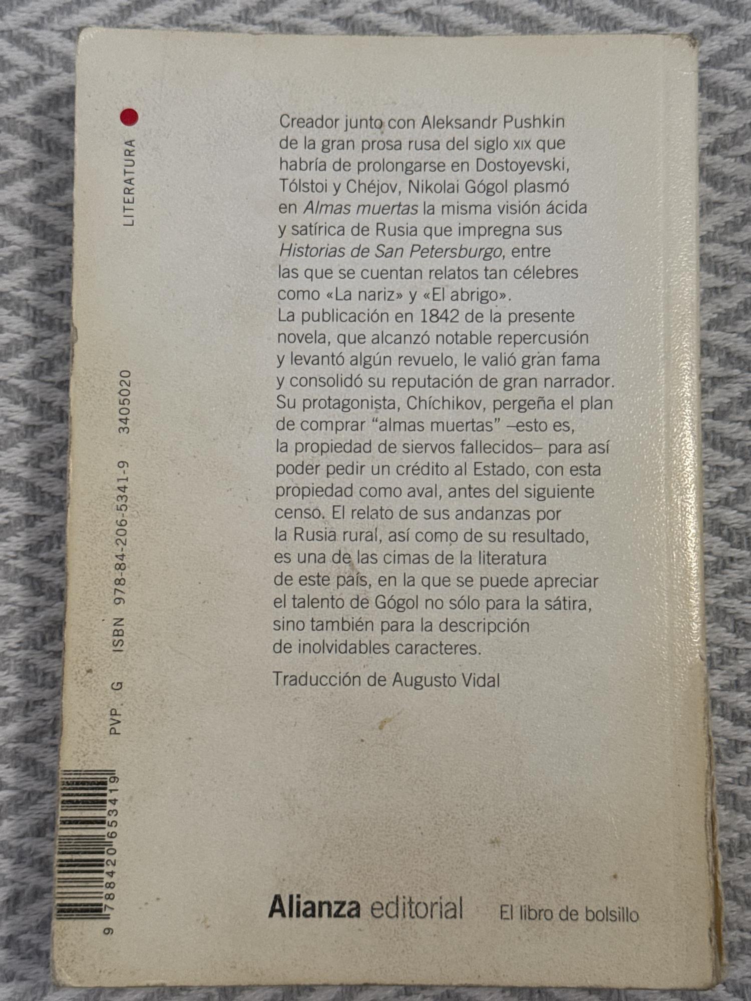 Almas muertas de Nikolái Gógol es una novela satírica en la que el protagonista viaja por la Rusia imperial comprando “almas muertas”, es decir, siervos fallecidos que aún figuran en los registros oficiales. A través de esta situación absurda, la obra critica la burocracia, la corrupción y las contradicciones de la sociedad rusa del siglo XIX.