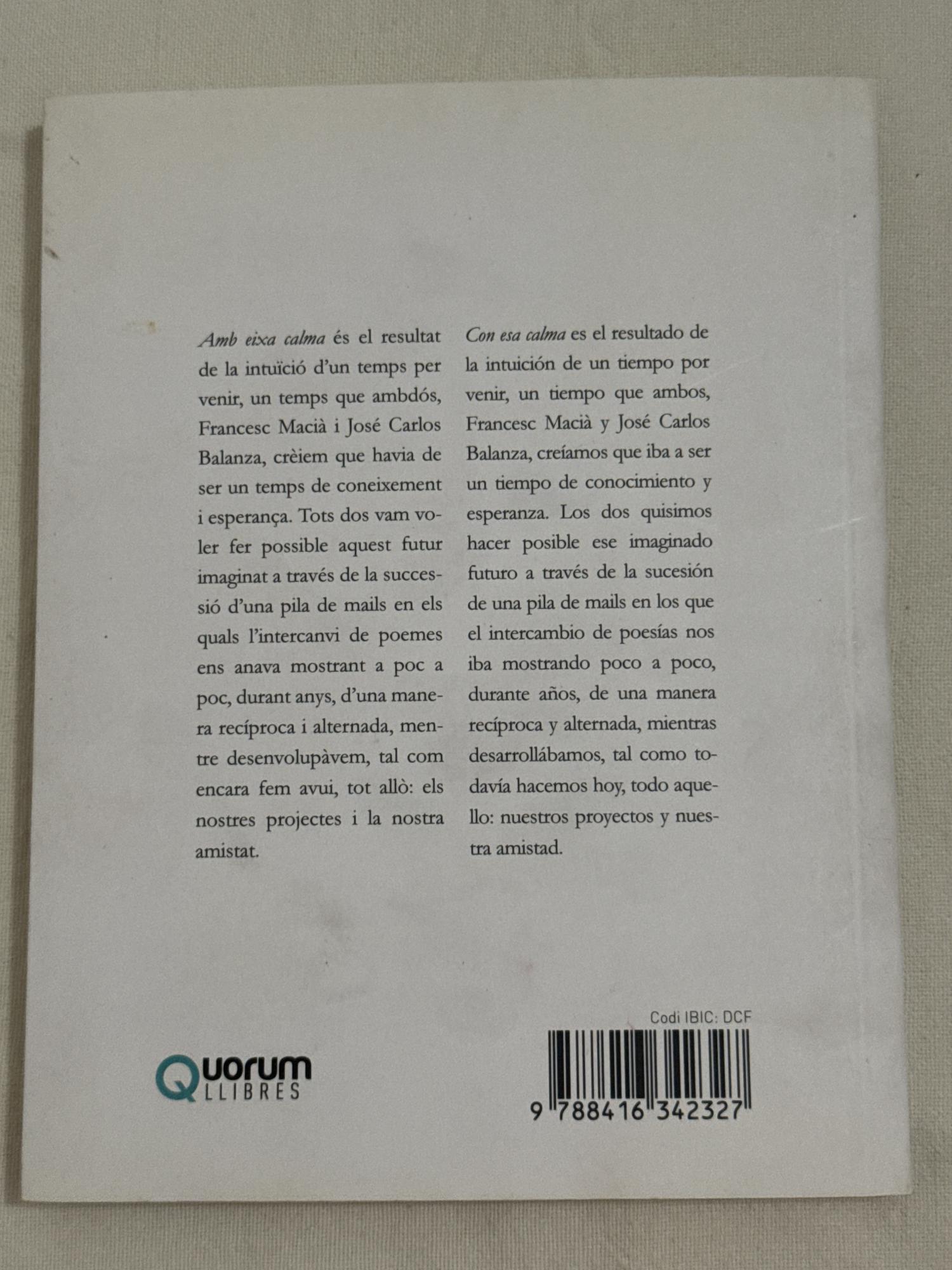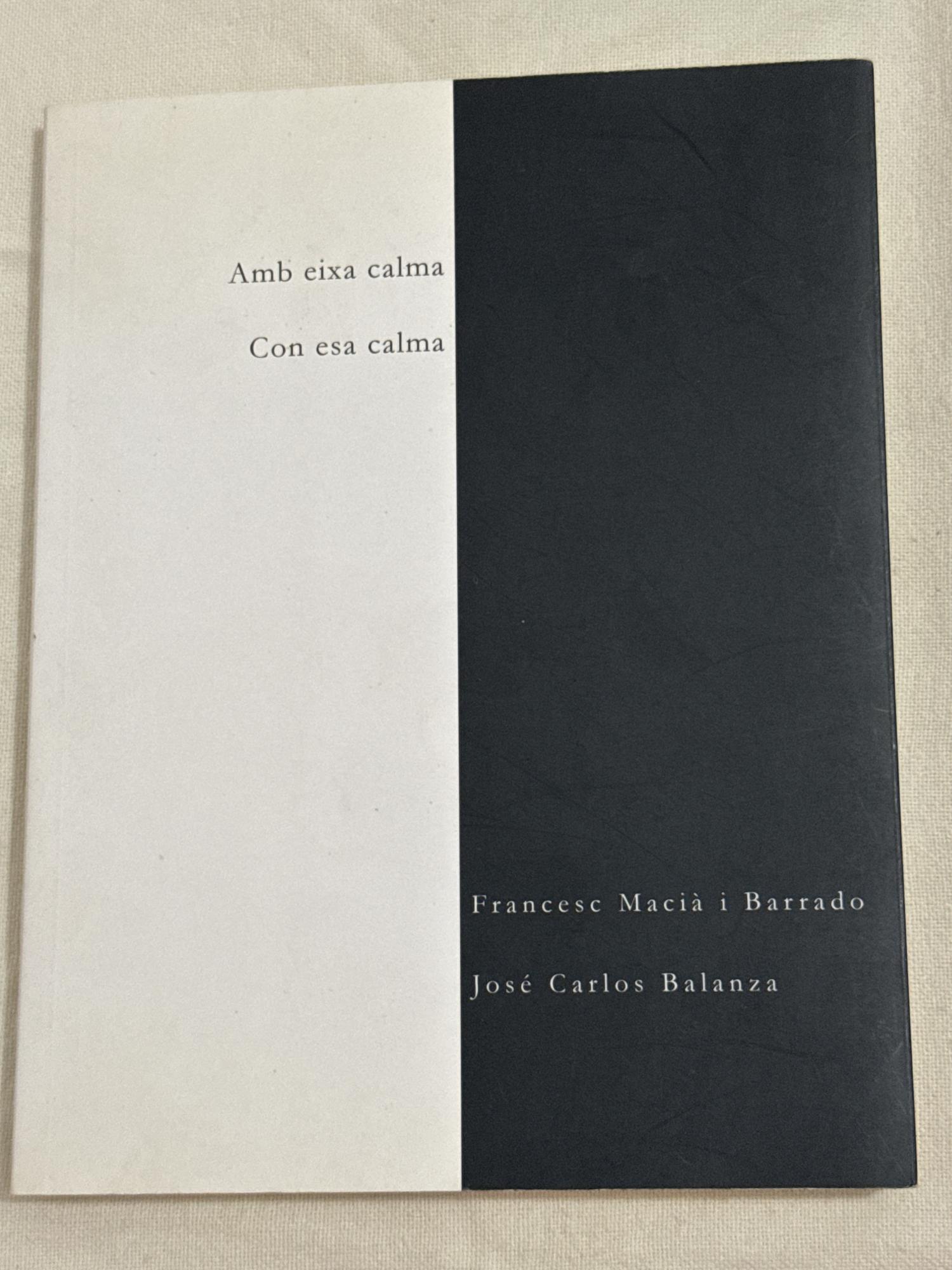 Amb eixa calma / Con esta calma és un llibre de poesia bilingüe (català-castellà) on dos autors comparteixen poemes sobre la calma, la natura i la identitat. És un diàleg poètic que explora emocions i cultures.