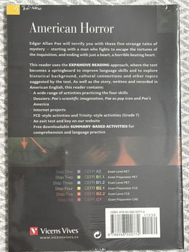 American Horror: Five Terrifying Tales de Edgar Allan Poe (edición adaptada) reúne cinco relatos de terror clásico, incluyendo historias de obsesiones, locura y muerte. Está adaptado para nivel B2.1 (uso del inglés intermedio alto) con soporte educativo como CD de audio y recursos adicionales.
