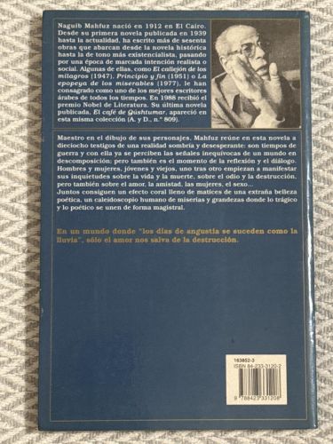 Amor bajo la lluvia de Naguib Mahfuz reúne las voces de dieciocho personajes que sobreviven en tiempos de guerra y transición social en Egipto. Sus relatos entrelazados exponen los conflictos entre tradición y modernidad, la tensión entre esperanza y violencia, y cómo el amor y la memoria luchan por persistir en medio del caos.
