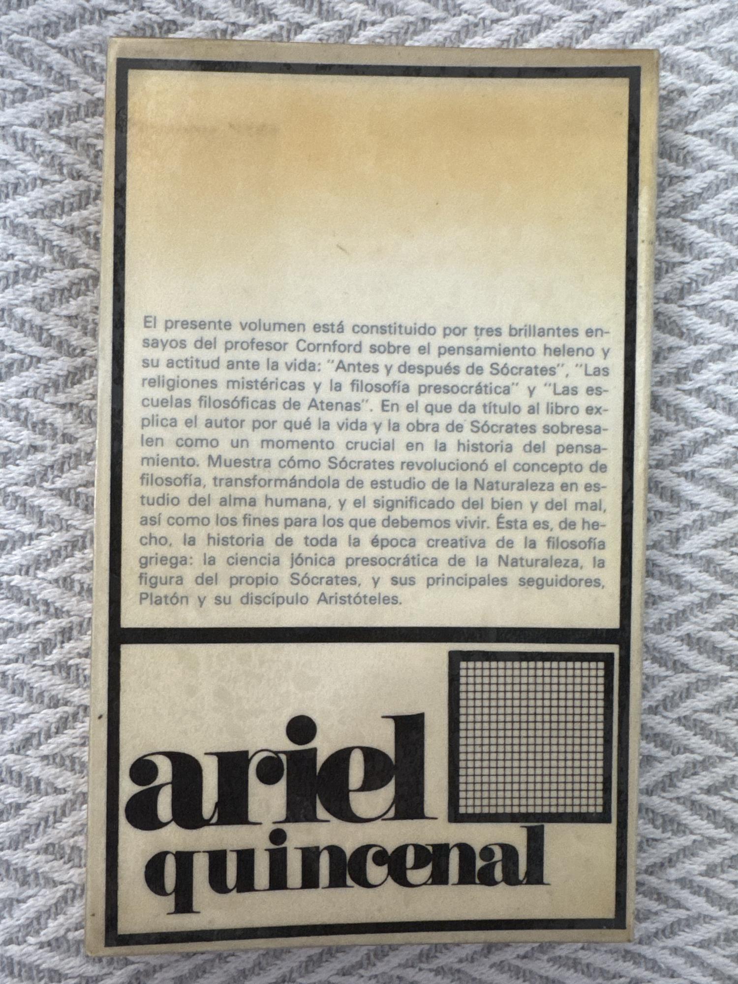 Antes y después de Sócrates de Francis Macdonald Cornford es un ensayo de historia de la filosofía que analiza el pensamiento griego anterior a Sócrates y las transformaciones intelectuales que se producen a partir de su figura. La obra expone con claridad el paso del mito al logos y la evolución de los problemas filosóficos fundamentales en la Grecia antigua.