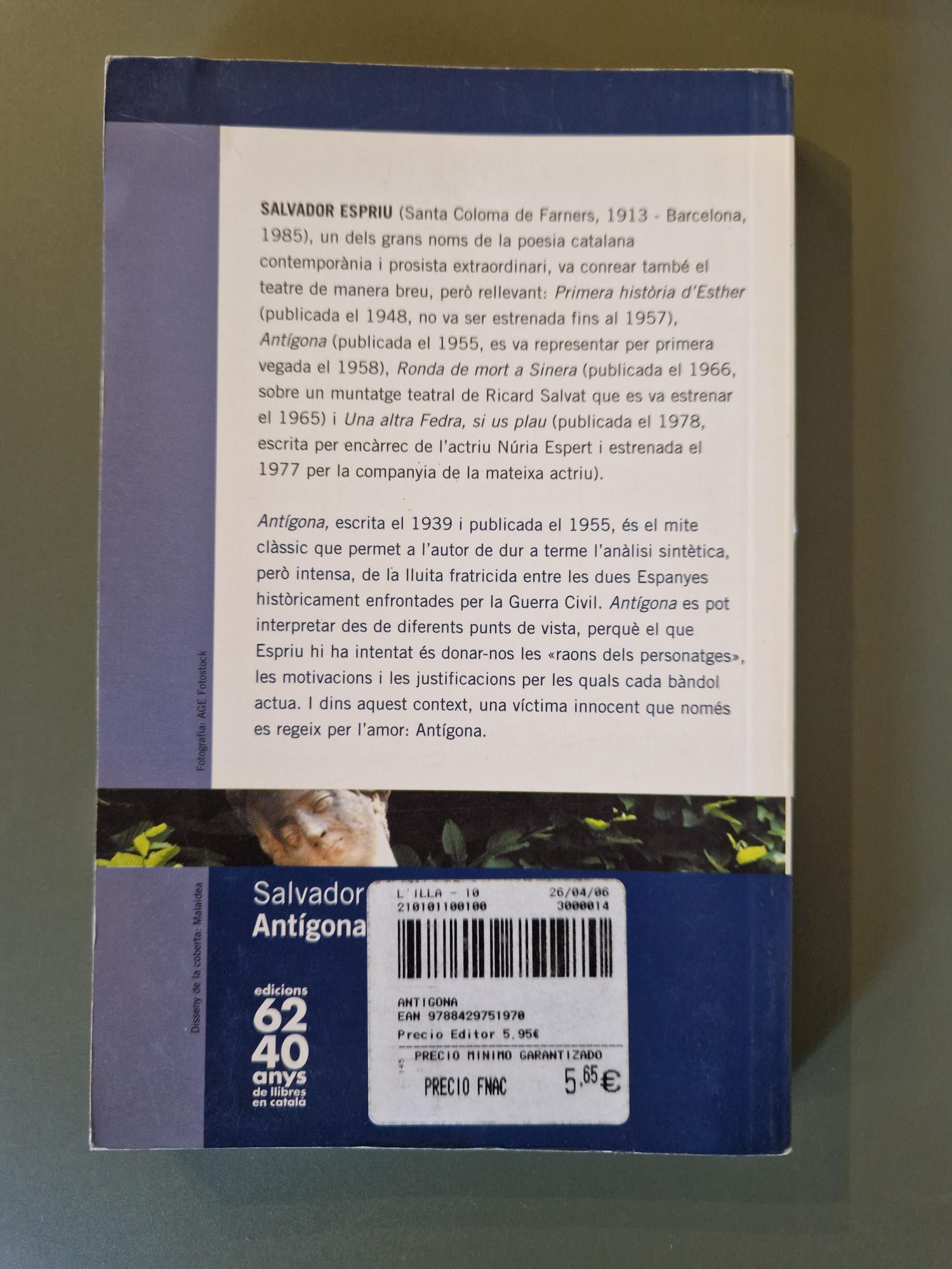 A Antígona, Salvador Espriu revisita el mite clàssic per denunciar la ferida col·lectiva i la responsabilitat moral després de la guerra. Enfrontant-se al poder amb una dignitat inalterable, l’Antígona d’Espriu emergeix també com una figura de resistència femenina que desafia l’autoritat imposada. Amb un llenguatge auster i colpidor, l’obra esdevé una reflexió profunda sobre la memòria, la justícia i el coratge de preservar la veritat.