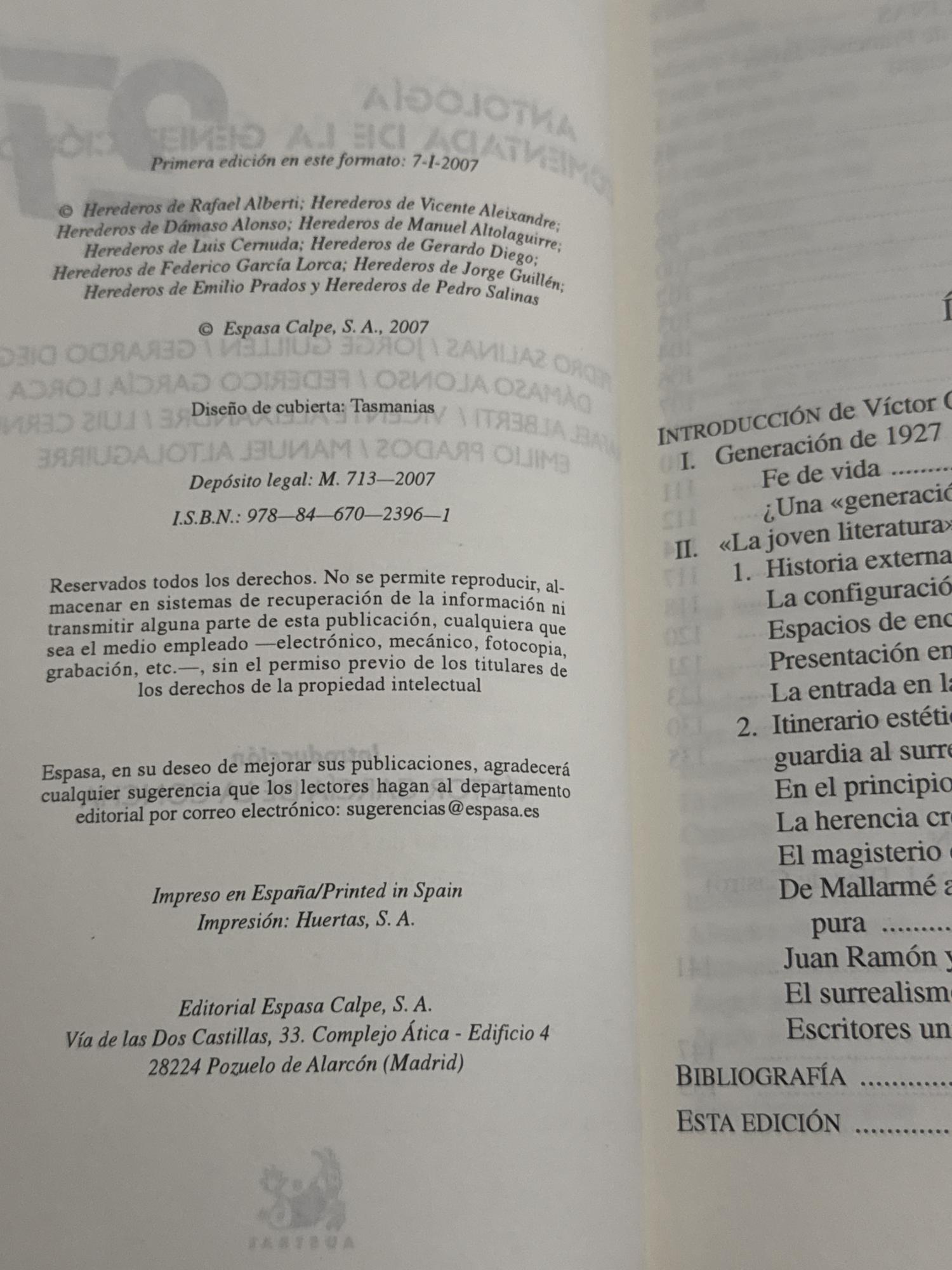 Se trata de una recopilación de poemas representativos de los miembros más destacados de la Generación del 27: Pedro Salinas, Jorge Guillén, Federico García Lorca, Rafael Alberti, Luis Cernuda, Vicente Aleixandre, entre otros.