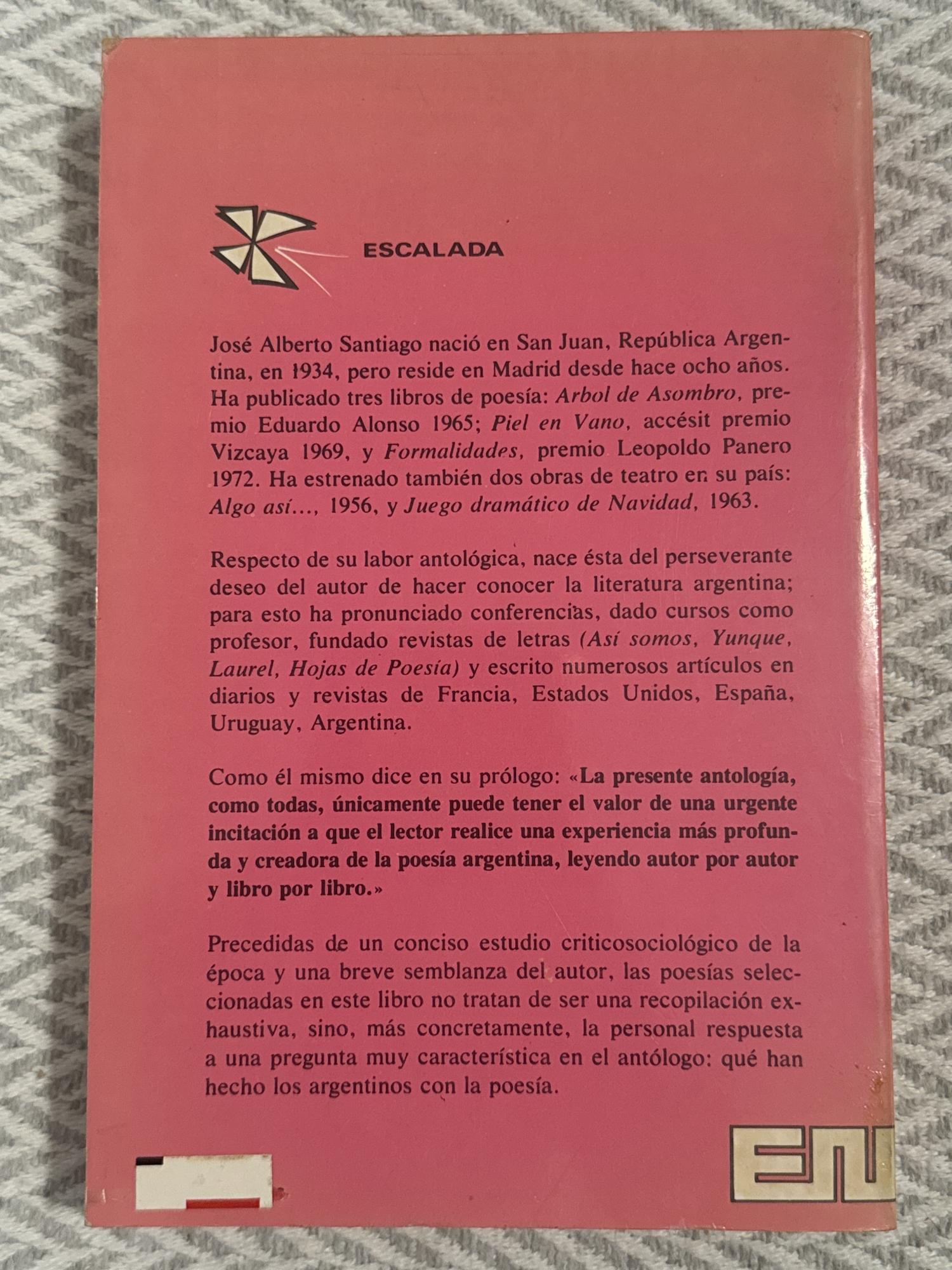 Antología de la poesía argentina compilada por José Alberto Santiago reúne una selección representativa de poemas y autores de la tradición poética argentina. El volumen ofrece un recorrido por diferentes épocas, estilos y corrientes literarias, permitiendo conocer la evolución y diversidad de la poesía del país.