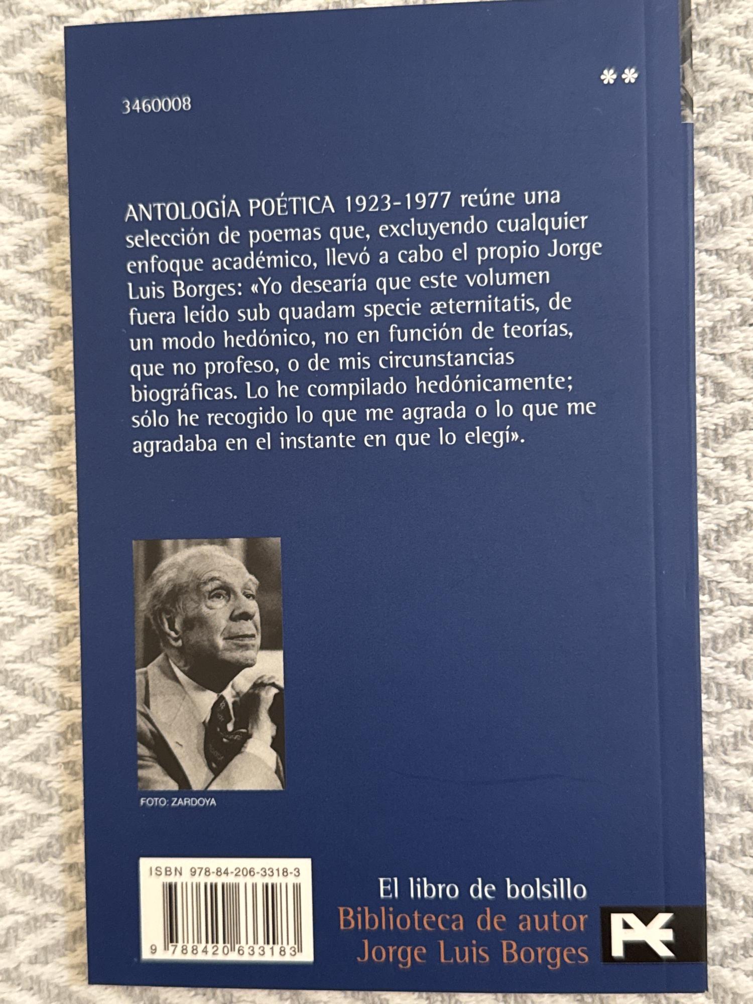 Resumen breve (2-3 frases): Esta antología reúne una selección de poemas que Borges eligió él mismo, a lo largo de más de medio siglo, sin pretensión académica.