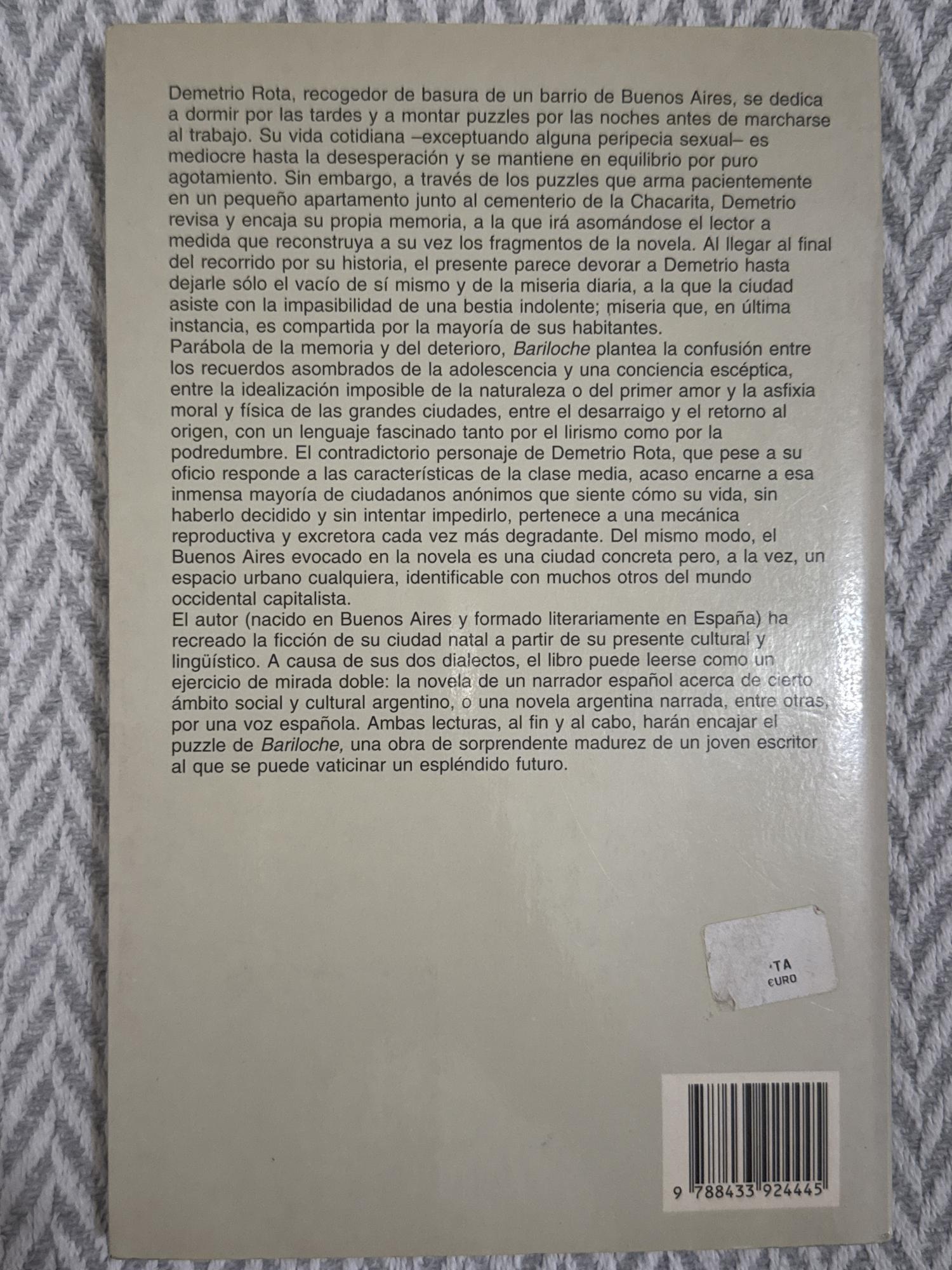 Bariloche de Andrés Neuman sigue a Demetrio Rota, un recogedor de basura en Buenos Aires, cuya rutina monótona se ve sacudida cuando comienza a ensamblar rompecabezas que le permiten reconstruir fragmentos de su memoria. A través de una voz íntima y poética, la novela reflexiona sobre el olvido, la identidad y la ciudad como espejo interior.