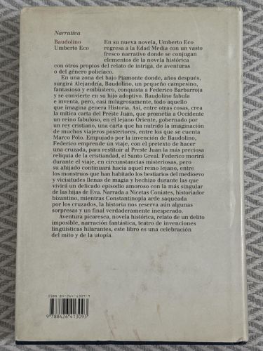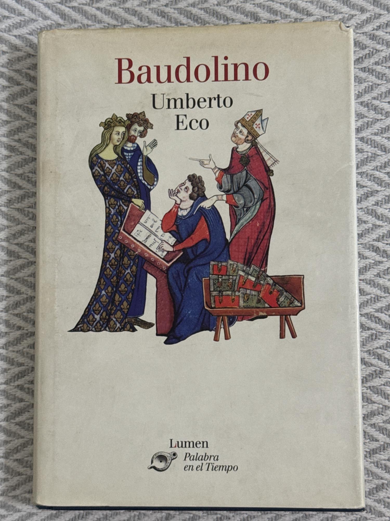 La novela está narrada en forma de autobiografía ficticia por Baudolino, un campesino del Piamonte del siglo XII que posee gran fantasía, talento con los idiomas y una gran capacidad para fabular.