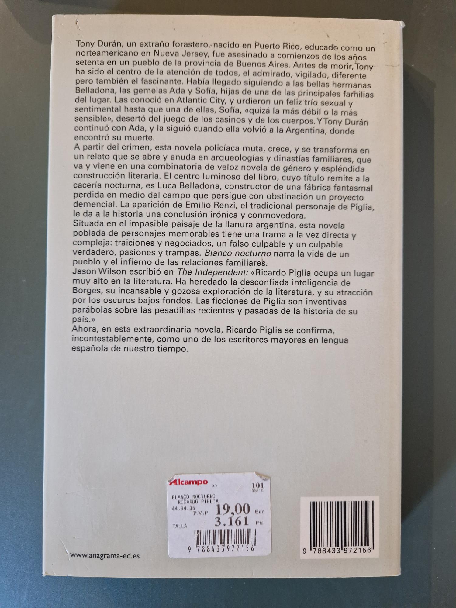 Blanco nocturno, de Ricardo Piglia, es una novela negra poderosa y precisa que explora los secretos de un pequeño pueblo argentino tras un crimen que altera su frágil equilibrio. El inspector Croce se adentra en una trama de intereses, silencios y tensiones sociales donde nada es lo que parece. Con su estilo inconfundible, Piglia construye un relato inquietante sobre el poder, la corrupción y las verdades que todos prefieren ocultar.
