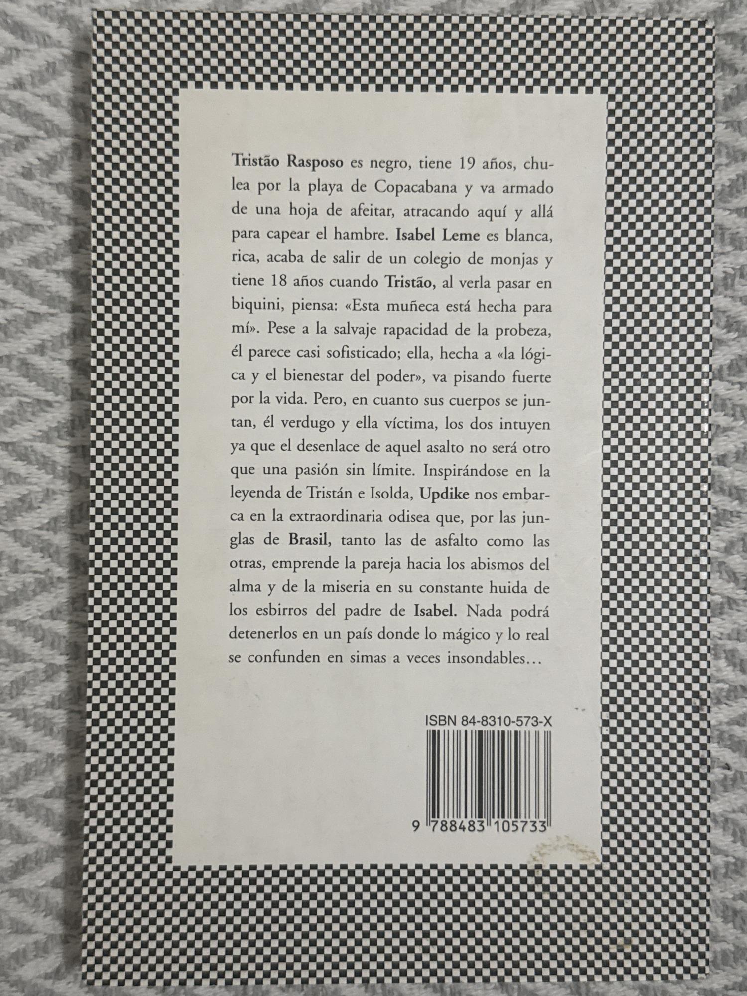 Brasil de John Updike cuenta cómo Tristão Raposo, un joven negro de 19 años que recurre al delito para sobrevivir, se enamora de Isabel Leme, una muchacha blanca y de clase alta. Su relación desafía barreras sociales, éticas y raciales, mientras la pareja huye de sus circunstancias y enfrenta la violencia, la desigualdad y la intensidad de una pasión prohibida.