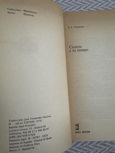 Analiza la figura de Cicerón en el contexto político, social e intelectual de la Roma republicana tardía. Utchenko estudia su pensamiento, su actividad política y su papel en la crisis de la República. La obra combina biografía y análisis histórico para comprender una época clave de la Antigüedad romana.