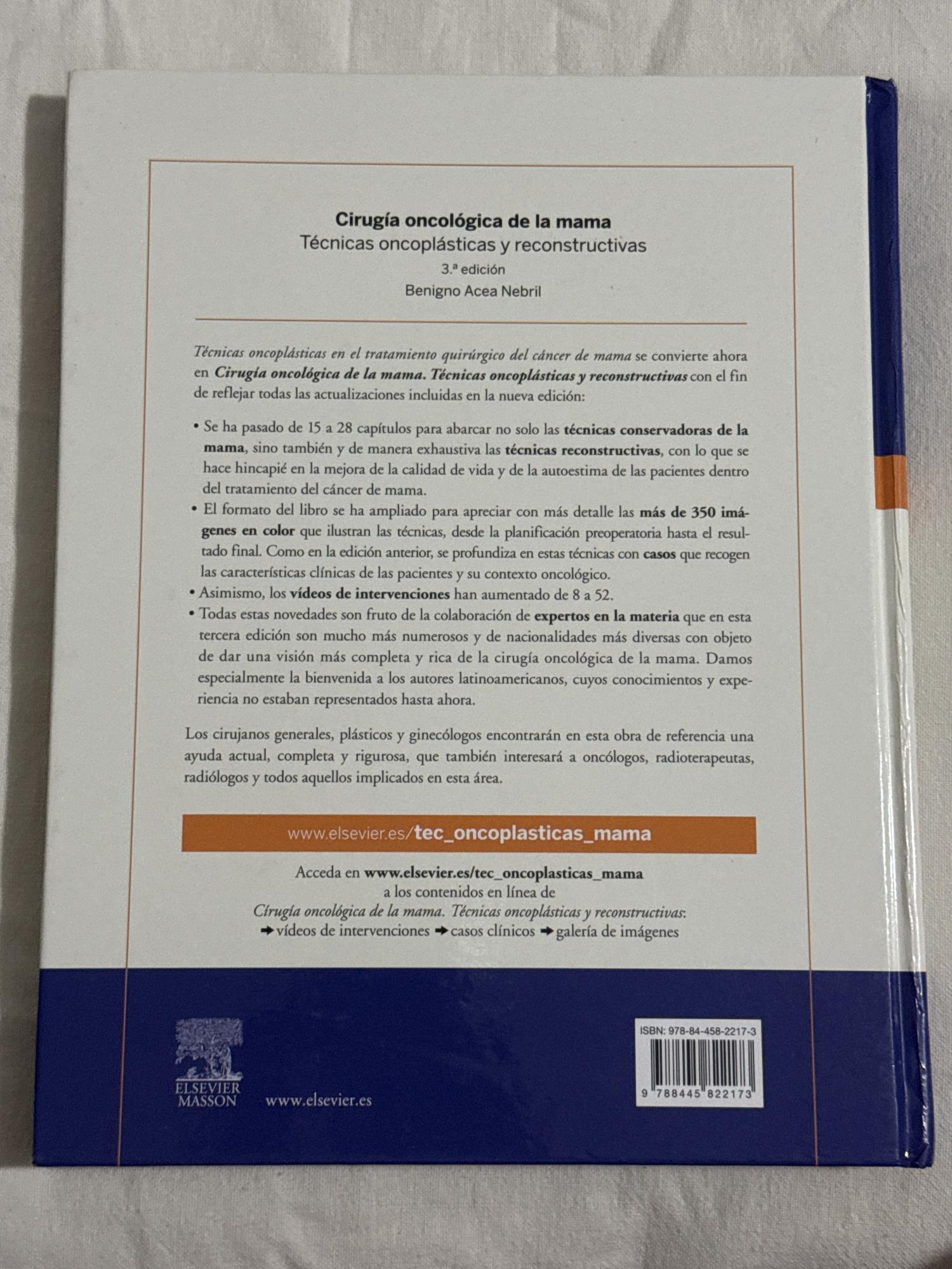 Cirugía Oncológica de la Mama de Benigno Acea Nebril es un manual completo sobre técnicas quirúrgicas para el tratamiento del cáncer de mama, incluyendo procedimientos oncoplásticos y reconstructivos, con imágenes y casos clínicos para apoyar a los profesionales de salud.