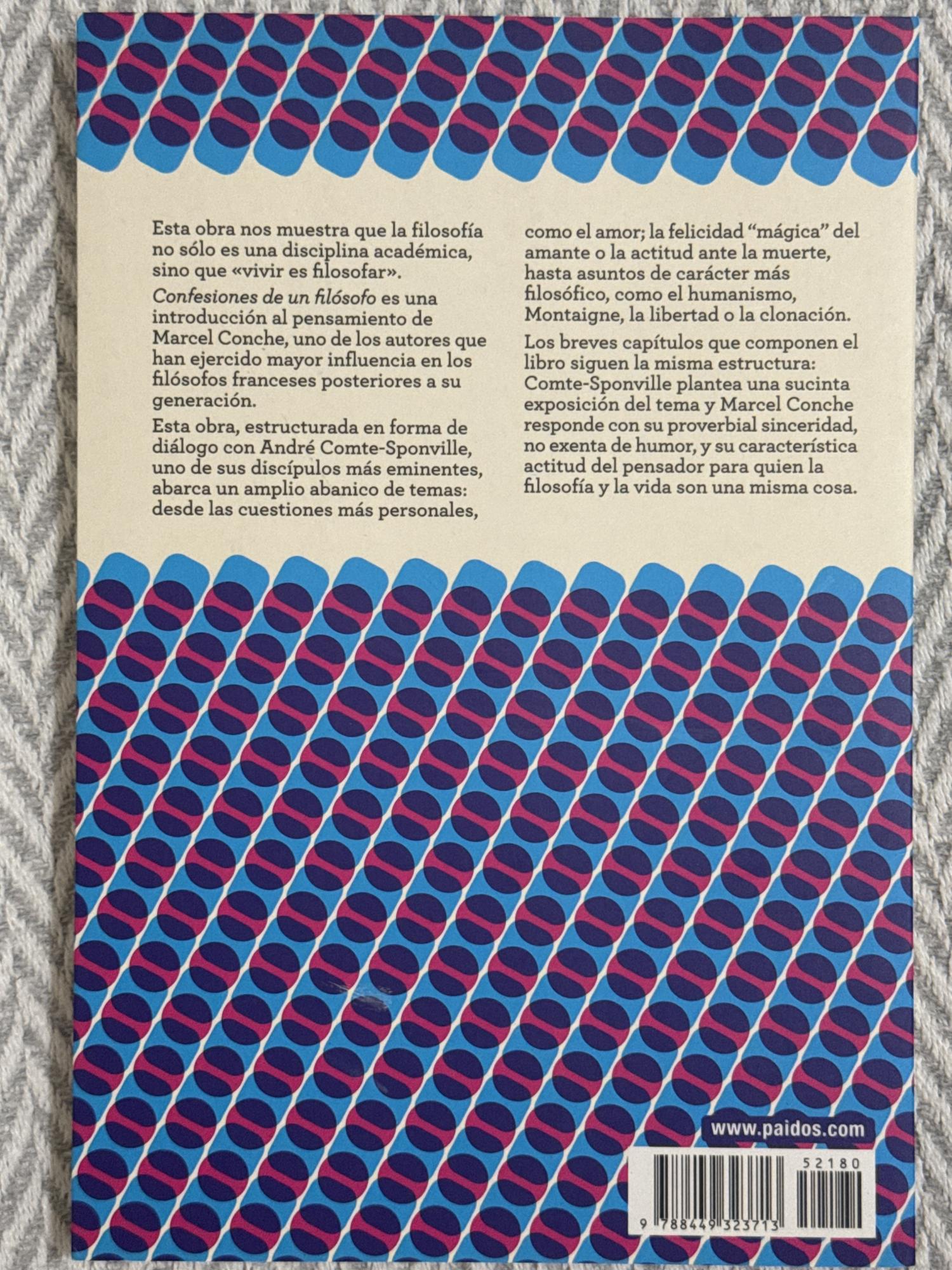 Confesiones de un filósofo – Respuestas a André Comte-Sponville de Marcel Conche presenta un intercambio filosófico íntimo sobre el amor, la felicidad, la muerte y la libertad. Con un tono sereno y personal, el autor muestra cómo la reflexión filosófica puede iluminar la experiencia humana.