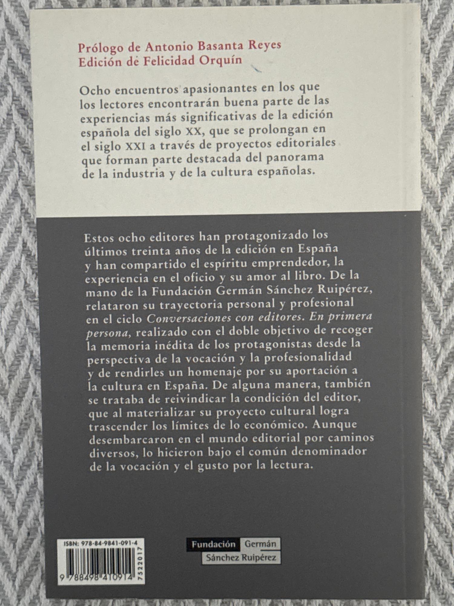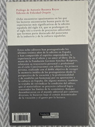 En primera persona: Conversaciones con editores recoge entrevistas con ocho figuras clave del mundo editorial español, donde narran sus comienzos, retos, éxitos y la pasión que tienen por los libros. Es un homenaje íntimo al oficio editorial, mostrando la mezcla de vocación, curiosidad y tenacidad que sustenta el arte de publicar.