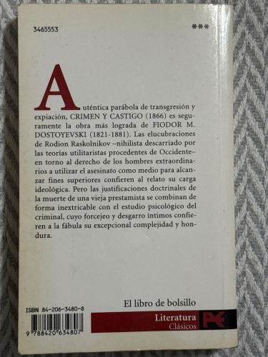 La novela relata la vida de Raskólnikov, un estudiante atormentado que comete un asesinato convencido de que puede romper las normas morales si tiene un propósito superior. Tras el crimen, su mente se ve consumida por la culpa, el miedo y los dilemas éticos que le empujan hacia la verdad. Dostoievski profundiza en la psicología humana y en el conflicto entre conciencia y justificación del mal.