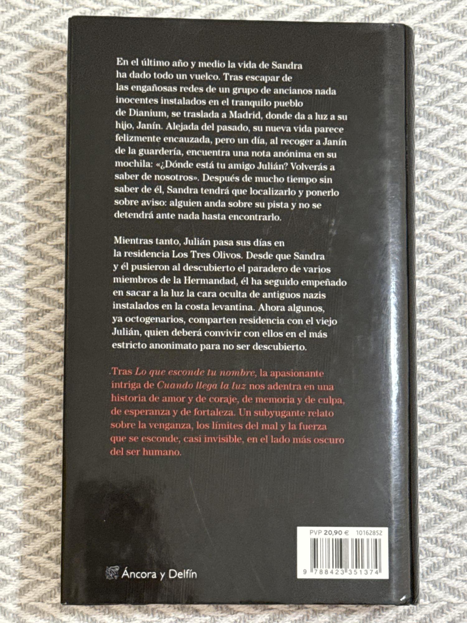 Cuando llega la luz de Clara Sánchez relata cómo Sandra, tras huir de redes manipuladoras, construye una vida nueva en Madrid con su hijo recién nacido. Pero su estabilidad se tambalea cuando encuentra una nota anónima con el nombre de Julián, viejo aliado, lo que la obliga a volver a enfrentarse con un pasado lleno de secretos y amenazas.