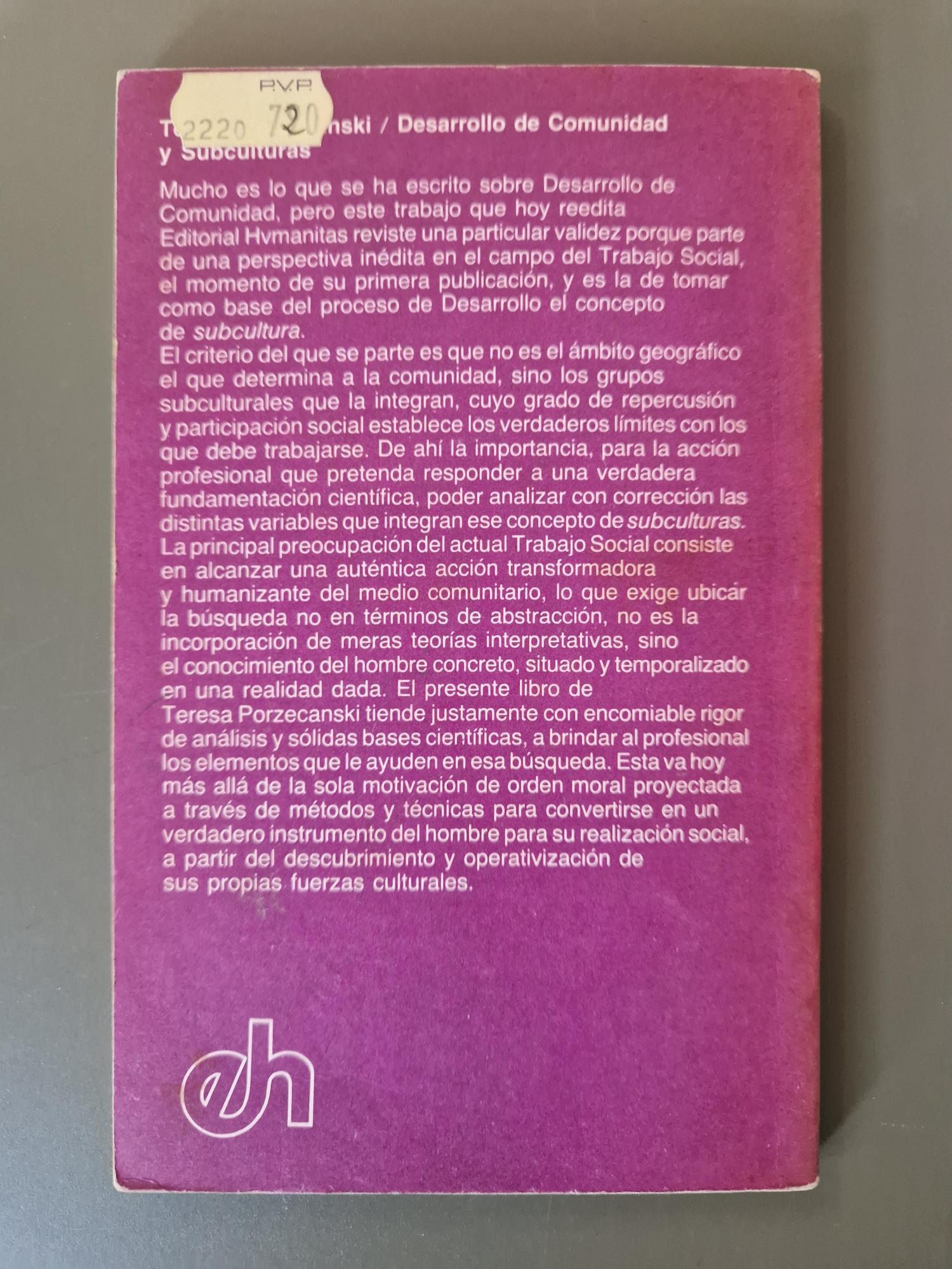 En Desarrollo de comunidad y subculturas, Teresa Porzecanski analiza las dinámicas sociales que configuran la vida comunitaria y la formación de subculturas en contextos urbanos y rurales. A partir de una perspectiva sociológica y antropológica, la autora examina los procesos de identidad, integración y cambio social. Esta obra ofrece herramientas conceptuales y metodológicas para comprender el desarrollo comunitario desde una mirada crítica y aplicada.