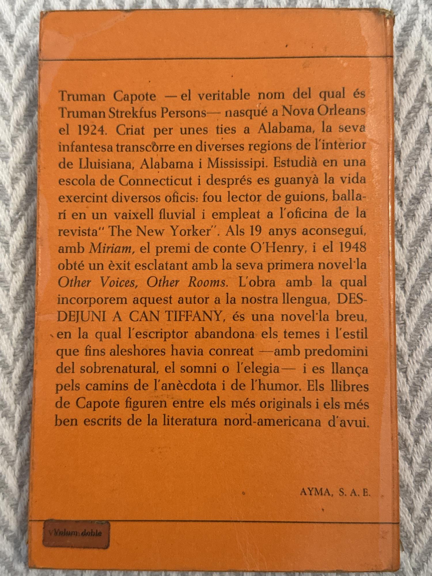 Desdejuni a Can Tiffany (Breakfast at Tiffany’s), de Truman Capote, narra la relació entre un escriptor i Holly Golightly, una jove enigmàtica i independent que viu a Nova York. A través del seu retrat, l’obra explora la identitat, la solitud i el desig de llibertat en un entorn urbà sofisticat i superficial.