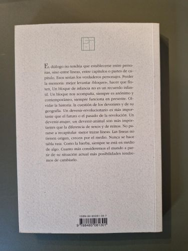 Diálogos, de Gilles Deleuze y Claire Parnet, es una conversación filosófica abierta y audaz que recorre algunos de los conceptos fundamentales del pensamiento deleuziano: los devenires, los rizomas, las líneas de fuga y la creatividad como forma de vida. A través de un intercambio vivo y sin jerarquías, los autores exploran modos de pensar que escapan a las estructuras fijas y apuestan por la experimentación constante. Una obra estimulante y accesible que invita a habitar la filosofía como un movimiento en transformación continua.