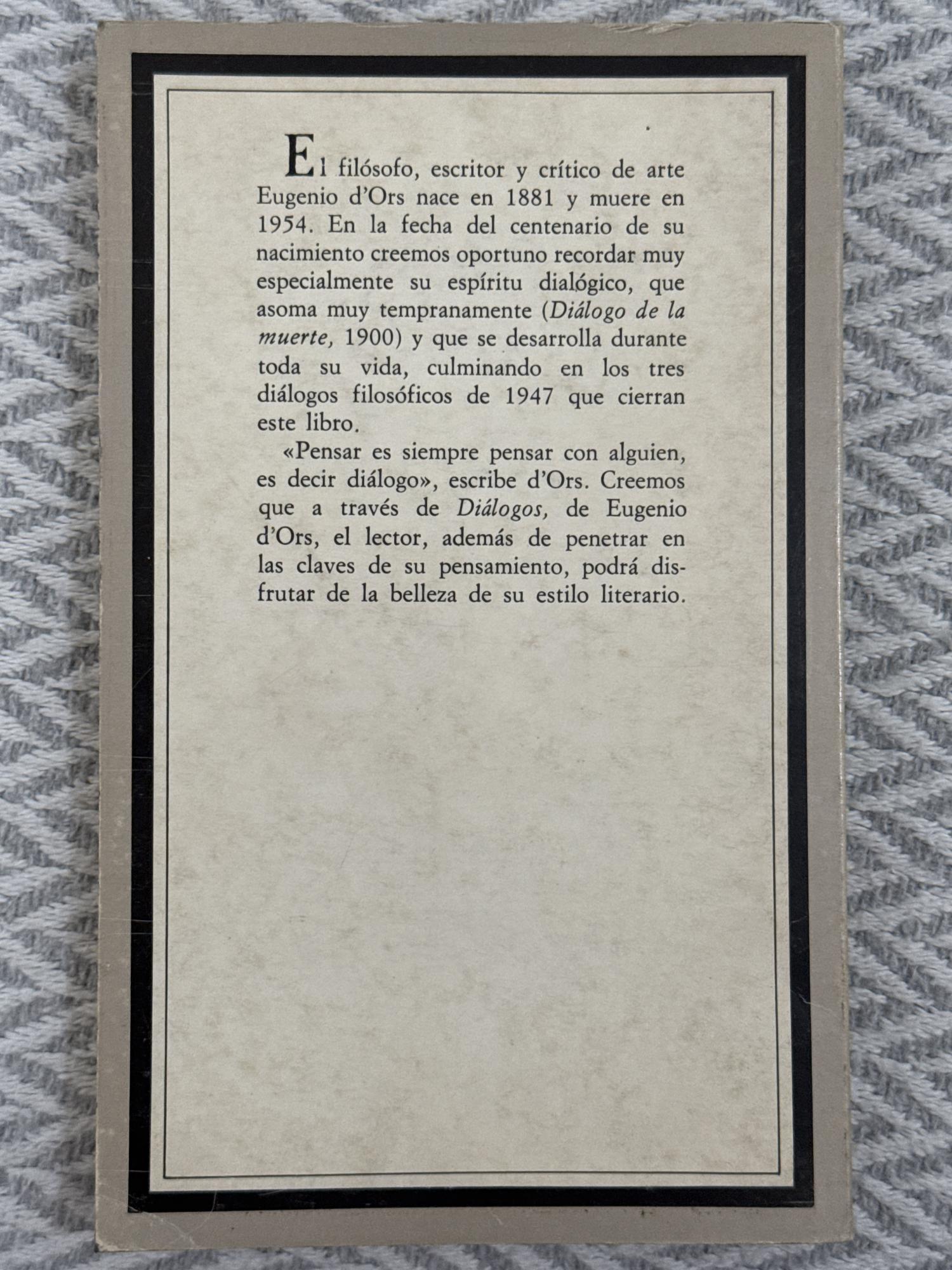 Diálogos de Eugenio d'Ors es una obra ensayística en forma dialogada en la que el autor expone ideas estéticas, filosóficas y culturales propias del novecentismo. A través del diálogo, desarrolla reflexiones sobre el pensamiento, el arte y la vida intelectual, combinando rigor conceptual con un estilo literario elaborado.