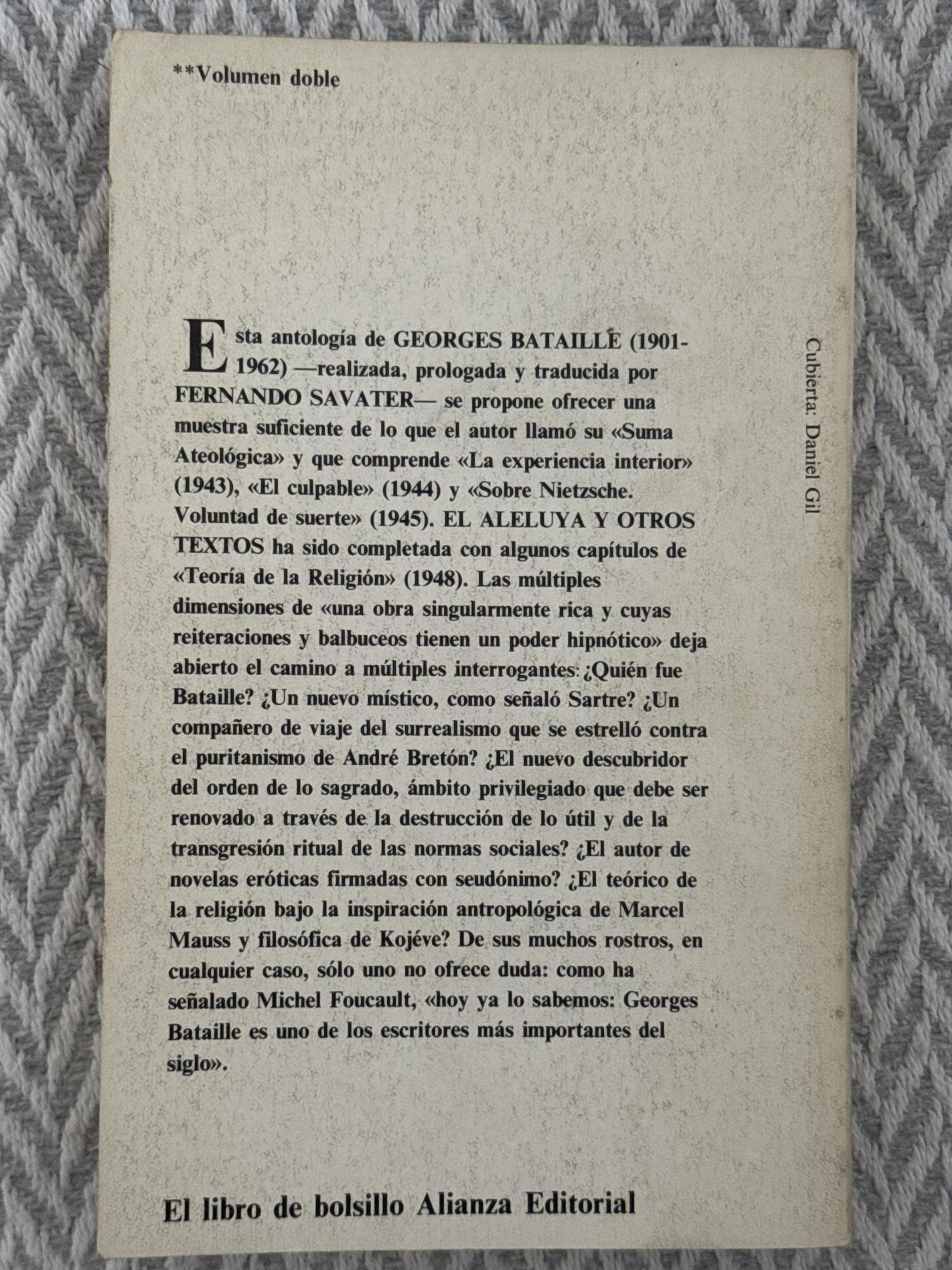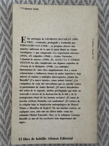 El aleluya y otros textos es una colección de escritos de Georges Bataille en los que explora temas como lo sagrado, la transgresión, el éxtasis y la experiencia humana más allá de los límites de la razón. A través de ensayos breves, el autor articula su visión del exceso, la violencia simbólica y la apertura a lo irracional como claves para comprender la cultura y la subjetividad.