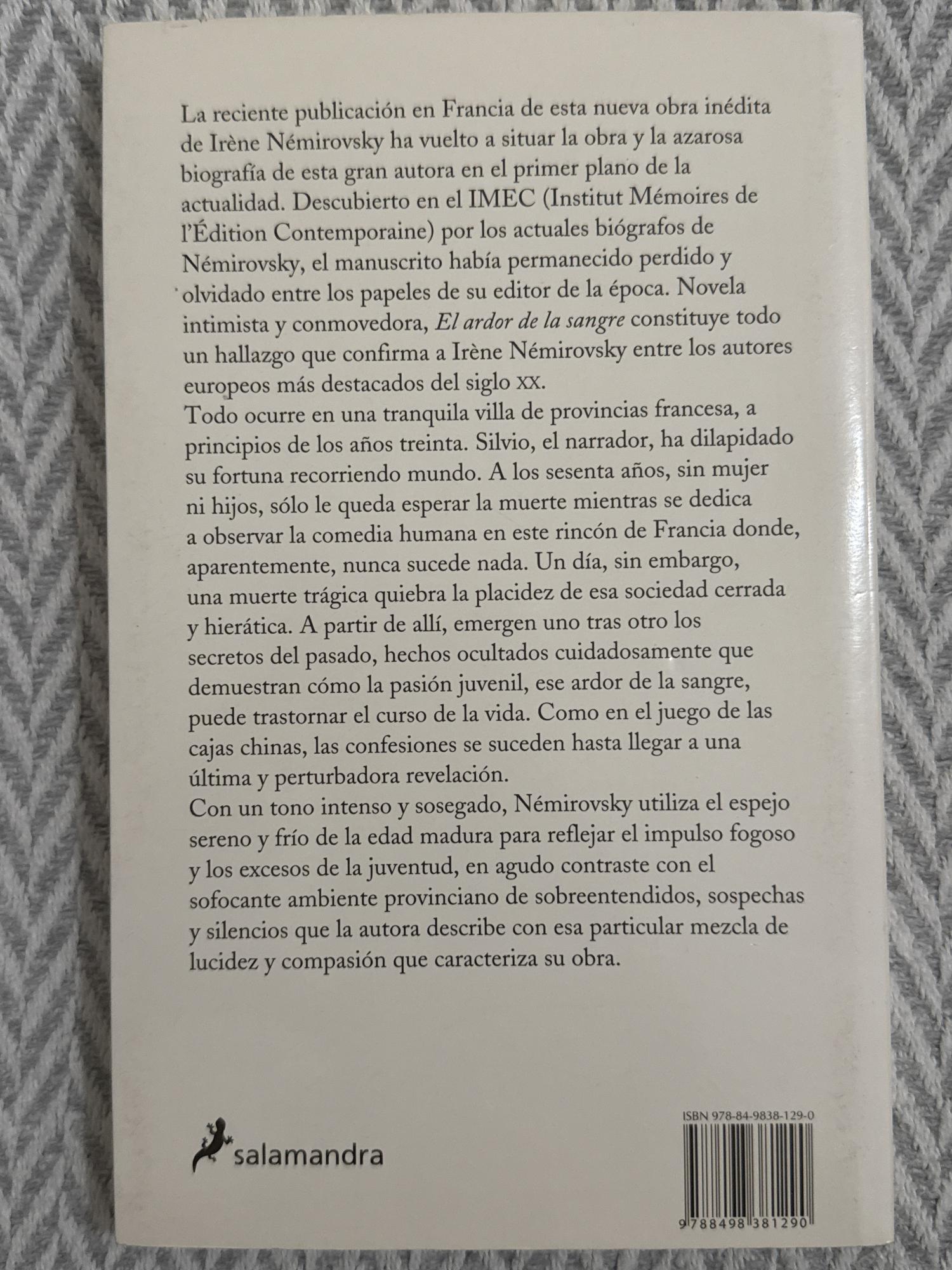 El ardor de la sangre de Irène Némirovsky relata cómo Silvio, un hombre maduro que ha dilapidado su fortuna viajando por el mundo, regresa a una villa provincial francesa donde una muerte inesperada desvela secretos ocultos del pasado, poniendo en contraste la pasión juvenil y la serenidad de la madurez.