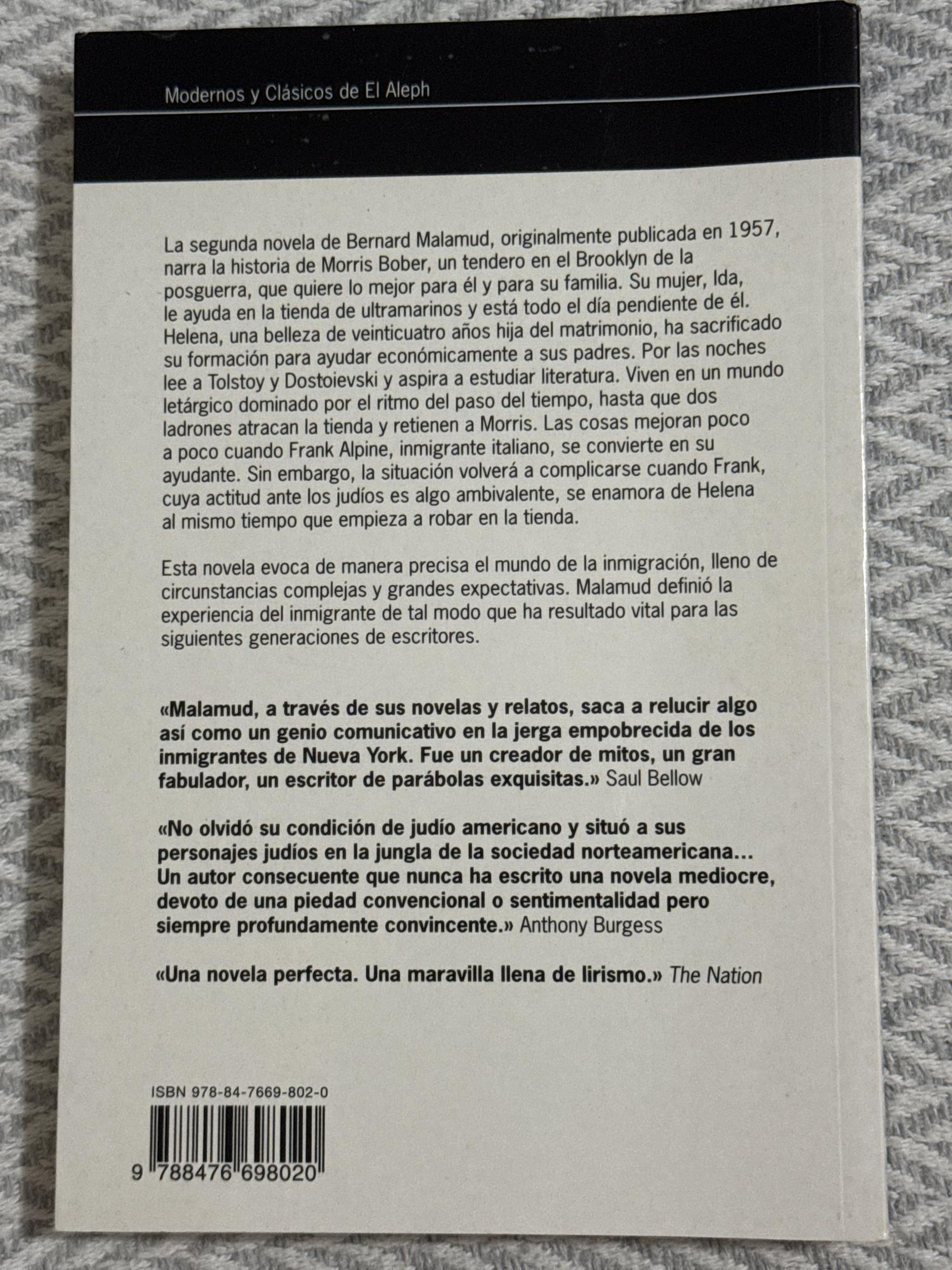 Morris Bober, propietario de una pequeña tienda de ultramarinos en el Brooklyn de la posguerra, lucha junto con su esposa Ida por mantener su negocio y cuidar de su hija Helena, quien abandona sus estudios para ayudarlos. Cuando Frank Alpine, un inmigrante italiano, entra a trabajar con ellos, su relación con la familia se complica al enamorarse de Helena y al mismo tiempo comenzar a robar de la tienda. La novela explora el peso del sacrificio, el conflicto moral y las tensiones de la inmersión cultural en el sueño americano.