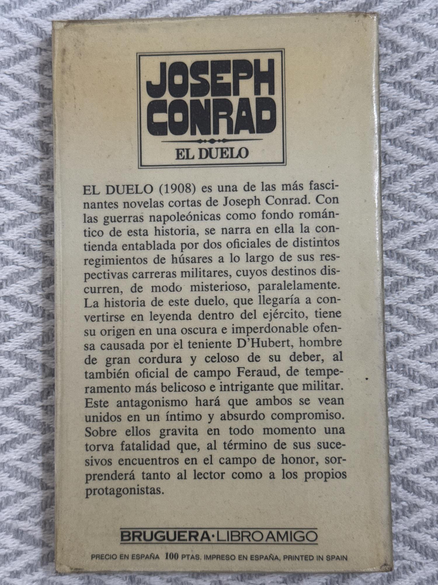 El duelo de Joseph Conrad es una novela corta ambientada en las guerras napoleónicas que narra la rivalidad obsesiva entre dos oficiales franceses que se baten en duelo a lo largo de años. La obra explora el honor, el orgullo y la irracionalidad humana, combinando trasfondo histórico con análisis psicológico.