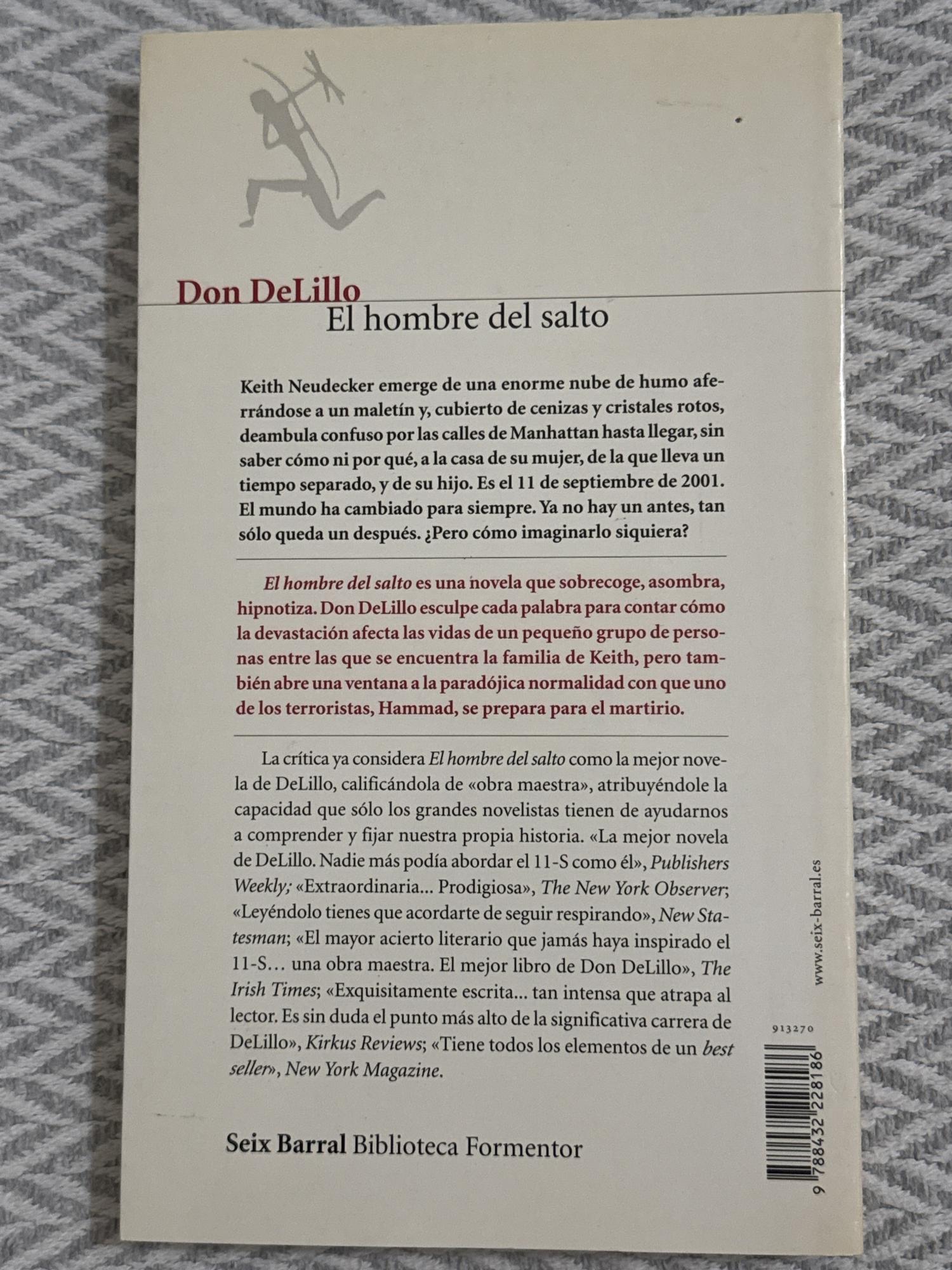 El hombre del salto de Don DeLillo sitúa su acción en el 11 de septiembre de 2001, cuando Keith Neudecker emerge entre humo y escombros en Manhattan buscando recomponer su vida junto a su exmujer e hijo. La catástrofe redefine su realidad personal y la de quienes le rodean, en una exploración intensa del trauma, la identidad y el modo en que el mundo cambia irrevocablemente tras el desastre.