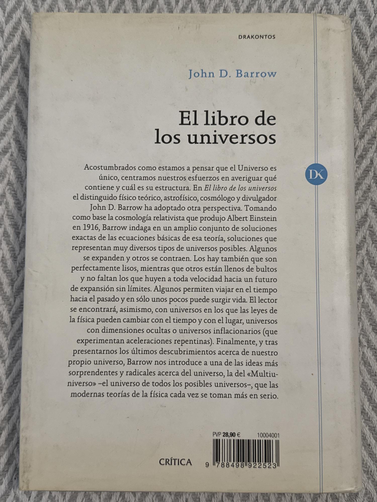 El libro ofrece un recorrido por las distintas concepciones del universo a lo largo de la historia, desde los modelos antiguos hasta las teorías cosmológicas modernas. Explica ideas como universos paralelos, geometrías del espacio y límites del conocimiento científico. Es una obra divulgativa que combina física, matemáticas y filosofía para explorar nuestra comprensión del cosmos.16x2