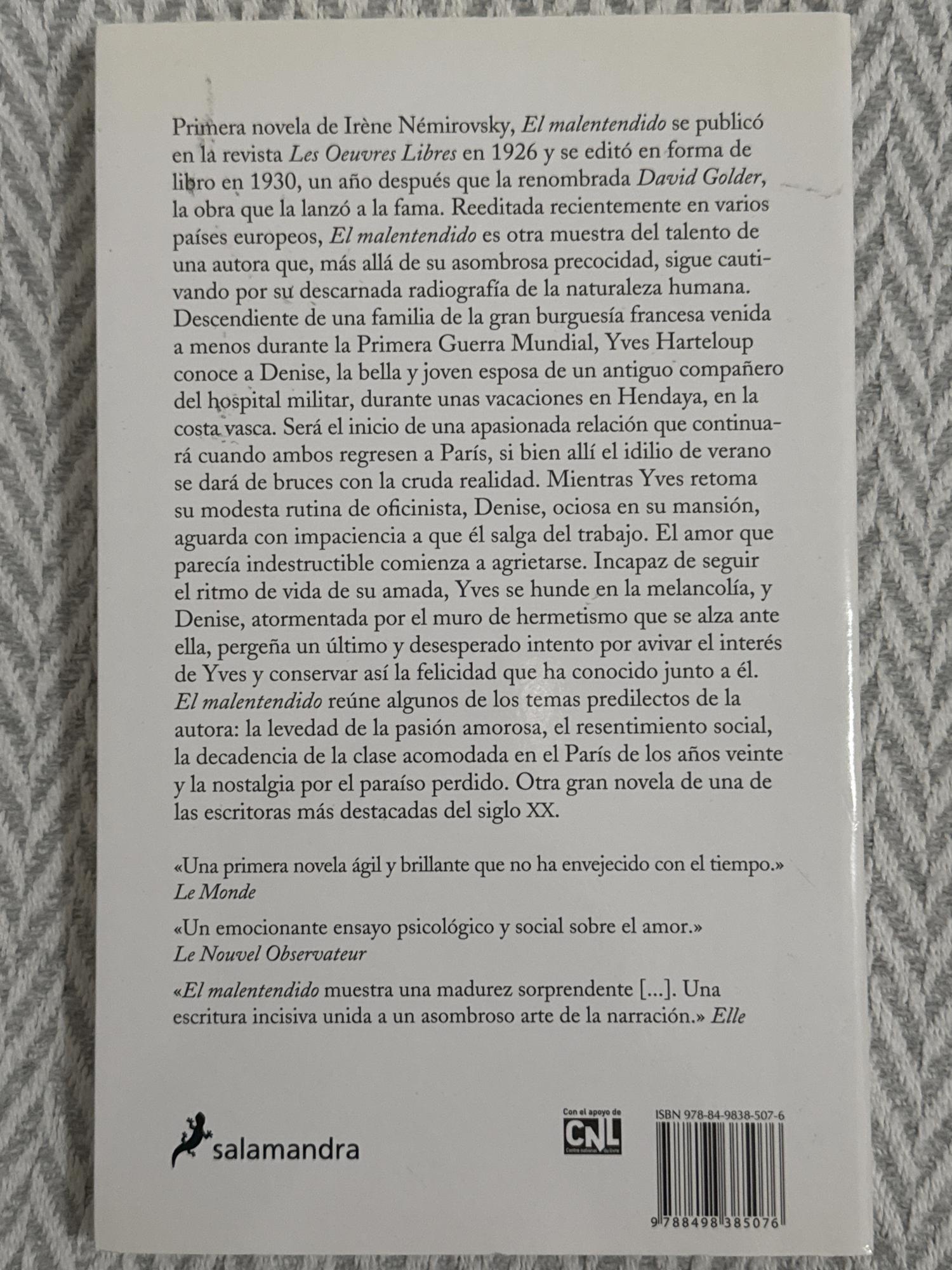 El malentendido de Irène Némirovsky relata el choque entre el ideal del amor romántico y la cruda realidad social: Yves conoce a Denise durante unas vacaciones veraniegas y entablan una apasionada relación, pero al volver a París sus vidas contrastantes y las tensiones emocionales empiezan a resquebrajar ese vínculo imperceptiblemente.