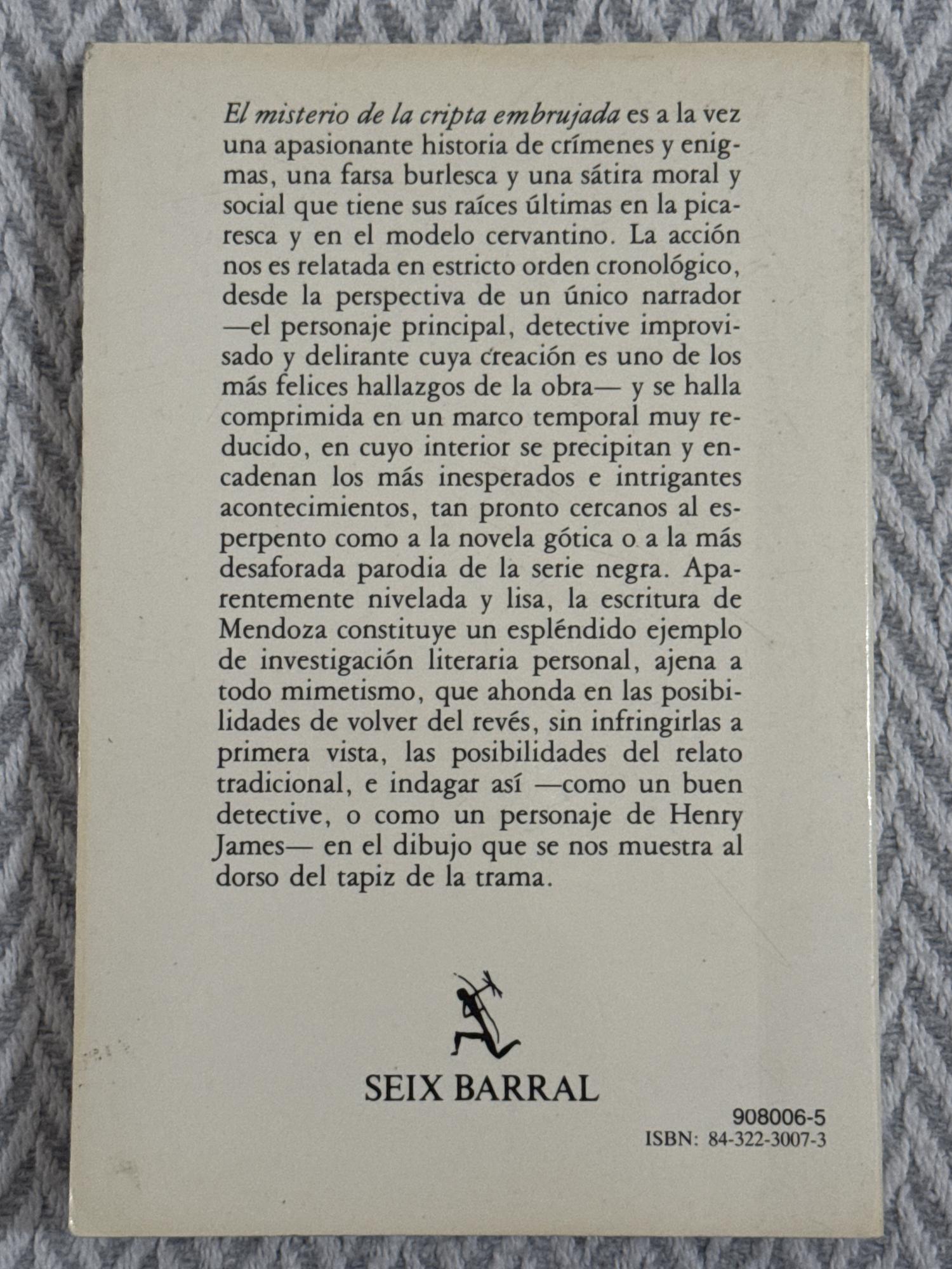 El misterio de la cripta embrujada sigue a un protagonista sin nombre que, liberado de un manicomio para ayudar a resolver la desaparición de una niña, se ve envuelto en una serie de enigmas y situaciones inesperadas en la Barcelona de los años setenta. La obra combina investigación policial con una sátira burlesca de los géneros detectivesco y picaresco, ofreciendo un tono desenfadado que juega con el absurdo y la crítica social. Su mezcla de humor, ironía y misterio convierte la lectura en una experiencia tanto intrigante como divertida.