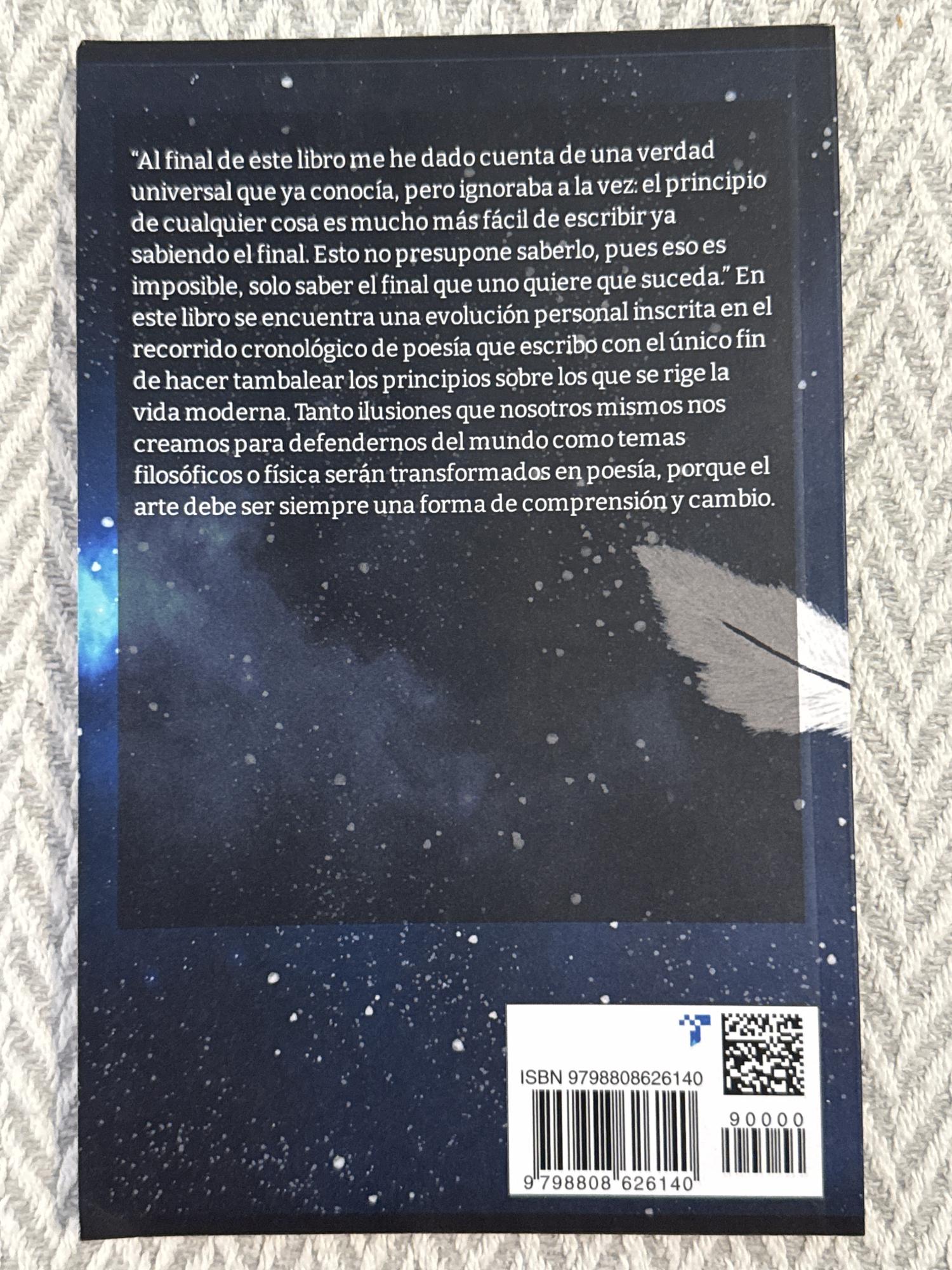 “Al final de este libro me he dado cuenta de una verdad universal que ya conocía, pero ignoraba a la vez: el principio de cualquier cosa es mucho más fácil de escribir ya sabiendo el final. Esto no presupone saberlo, pues eso es imposible, solo saber el final que uno quiere que suceda.” En este libro se encuentra una evolución personal sujeta en el recorrido cronológico de poesía que escribo con el único fin de hacer tambalear los principios sobre los que se rige la vida moderna. Tanto ilusiones que nosotros mismos nos creamos para defendernos del mundo como temas filosóficos o física serán transformados en poesía, porque el arte debe ser siempre una forma de comprensión y cambio.