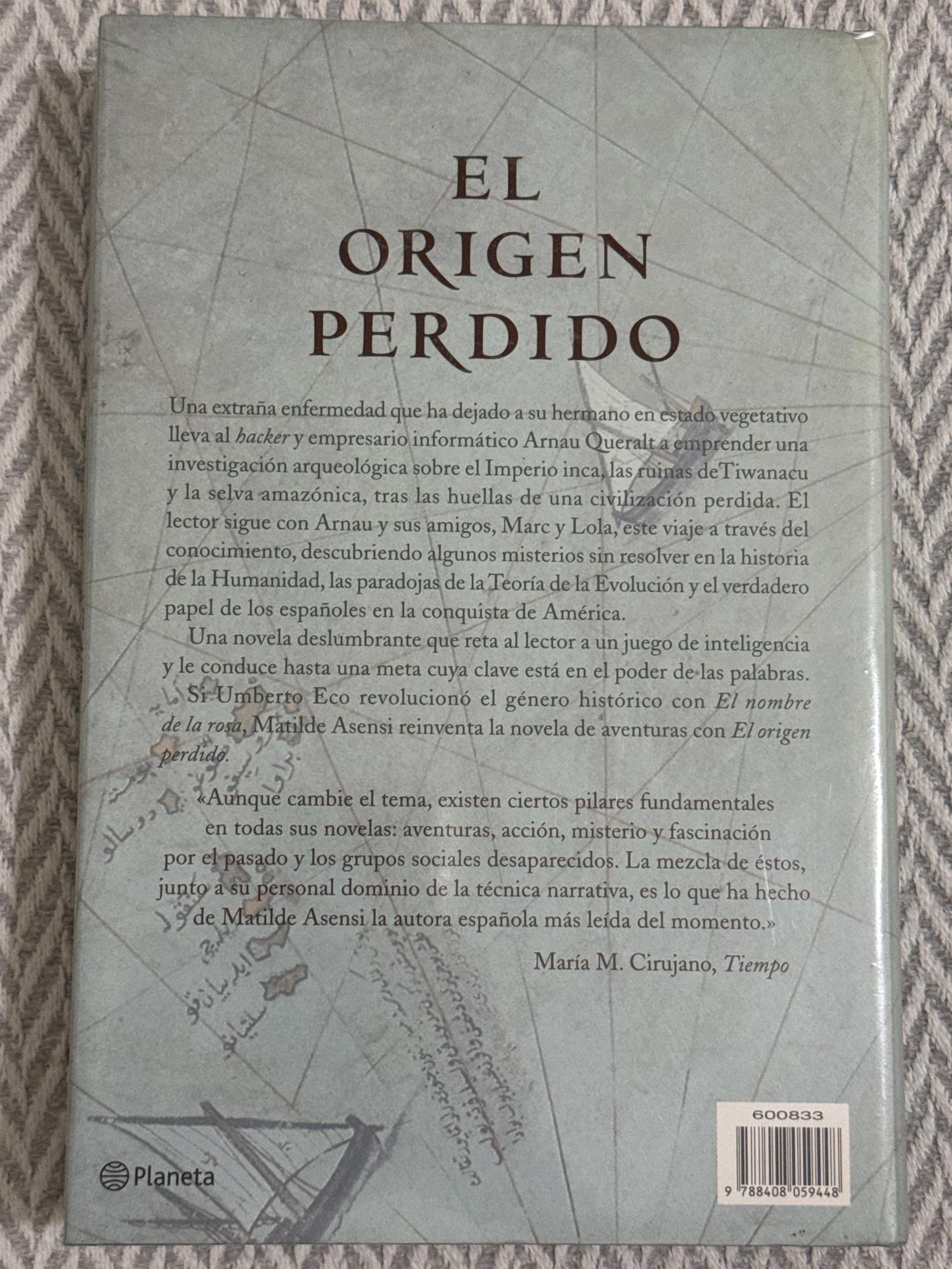 El origen perdido de Matilde Asensi mezcla misterio, arqueología y tecnología al seguir a Arnau Queralt en una odisea entre la selva amazónica, el imperio inca y antiguas civilizaciones, en busca de respuestas para una enfermedad que aqueja a un ser querido.
