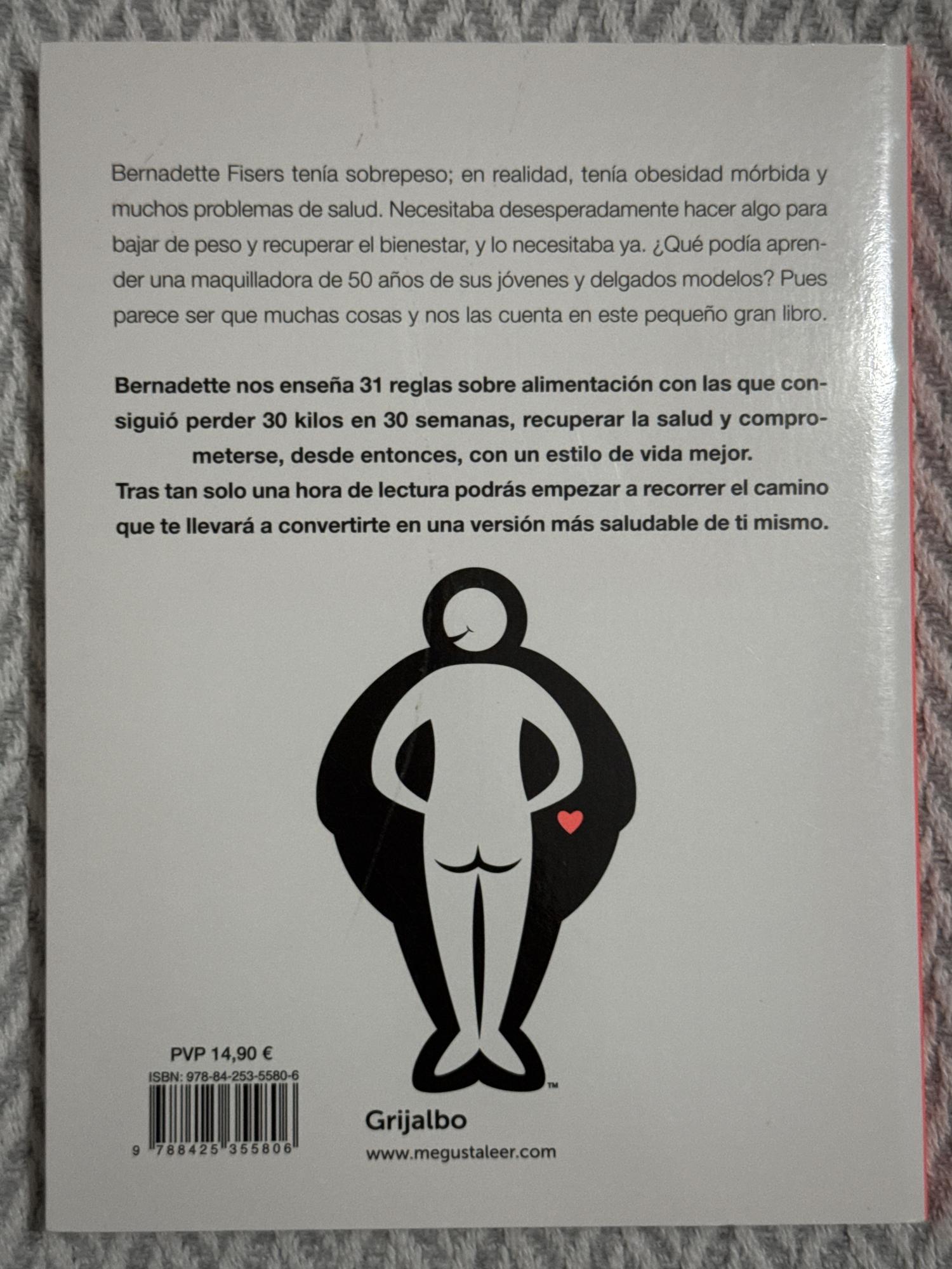 El pequeño libro para perder mucho peso de Bernadette Fisers propone 31 reglas sobre alimentación y estilo de vida para adelgazar de manera progresiva y sostenible. La autora comparte su propia experiencia con obesidad mórbida y cómo logró perder 30 kg en 30 semanas con cambios efectivos.