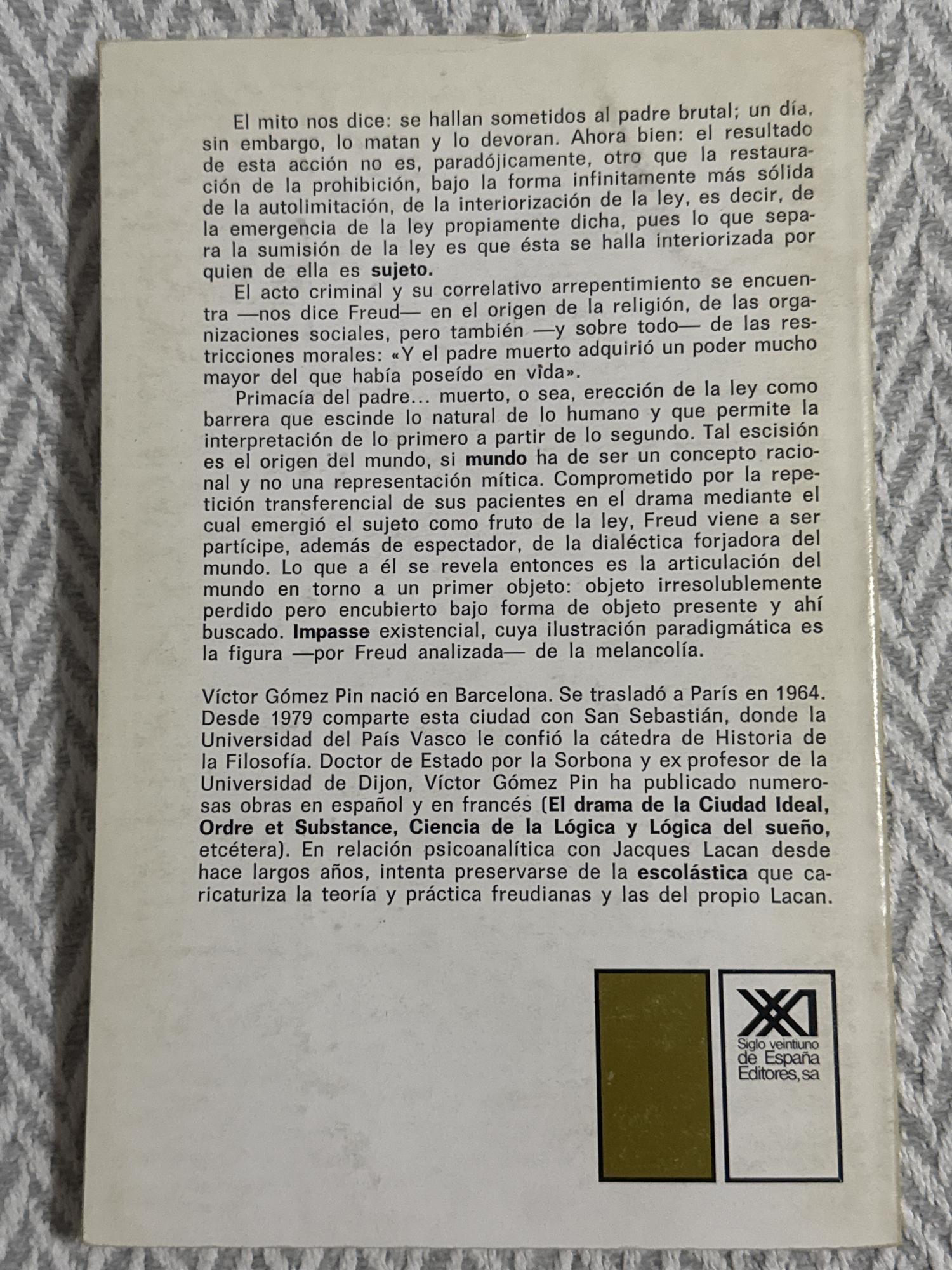 El autor explora el origen de la ley y su internalización en el ser humano a partir del mito del padre brutal: primero es sometido, luego asesinado, y paradójicamente tras su muerte adquiere más poder. Esta metáfora sirve para explicar cómo la prohibición interna (la ley interiorizada) surge del acto criminal y del arrepentimiento. La obra vincula este proceso con la religión, la moral, la organización social y la psicología del sujeto.