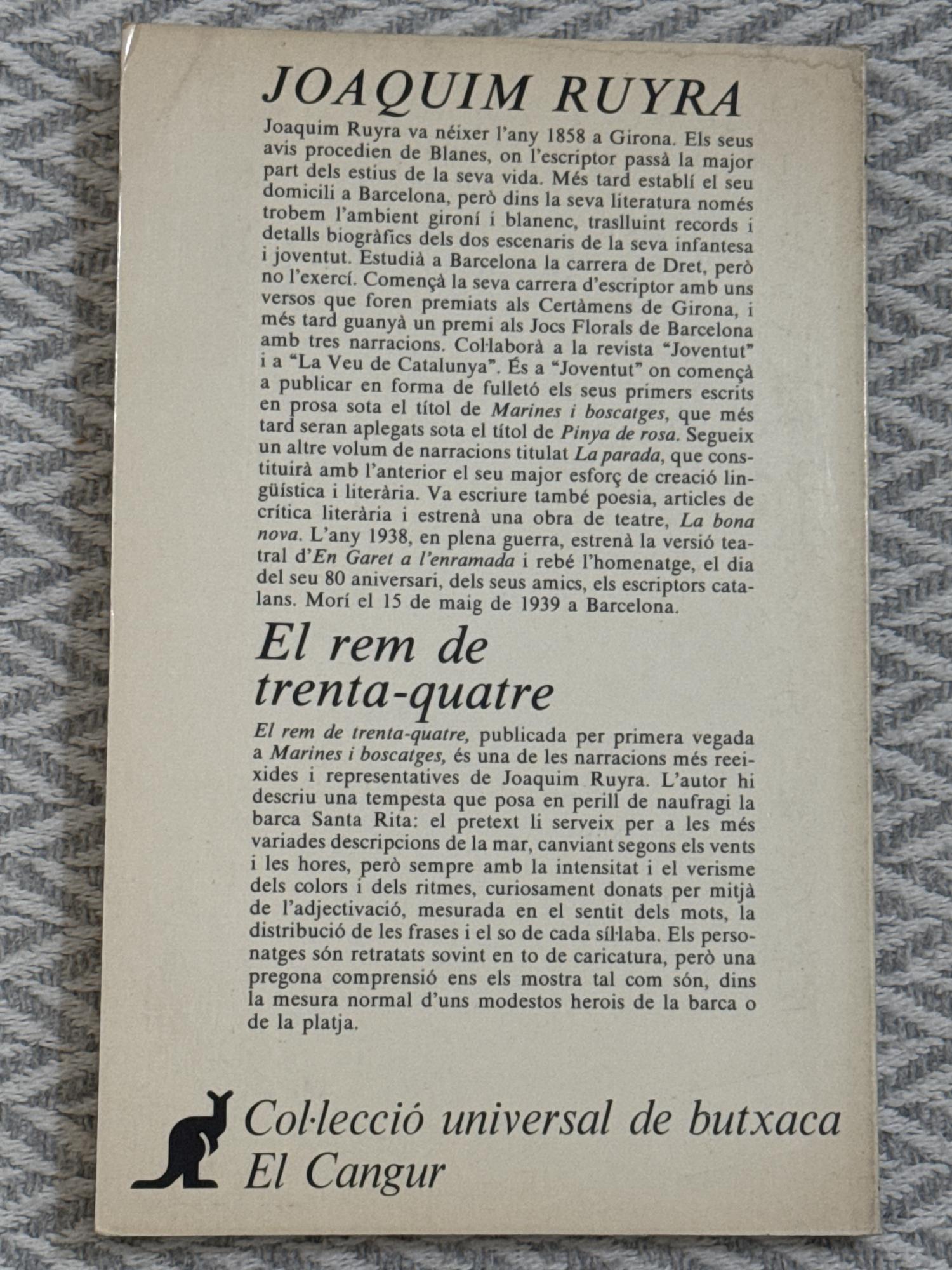 El rem de trenta-quatre explica l’aventura marinera de la barca Santa Rita, dedicada al cabotatge per la costa catalana. La narradora descriu amb detall la vida a bord, les feines dures dels mariners, el paisatge canviant i la força del mar. Al llarg del relat s’hi combinen l’admiració per la bellesa natural amb la consciència del risc constant que comporta navegar. També hi apareixen les relacions humanes dins la tripulació, la camaraderia i la disciplina necessàries per superar les dificultats. L’obra és una mostra del realisme i la sensibilitat de Ruyra, que sap reflectir la vida marinera amb precisió i alhora amb to poètic.