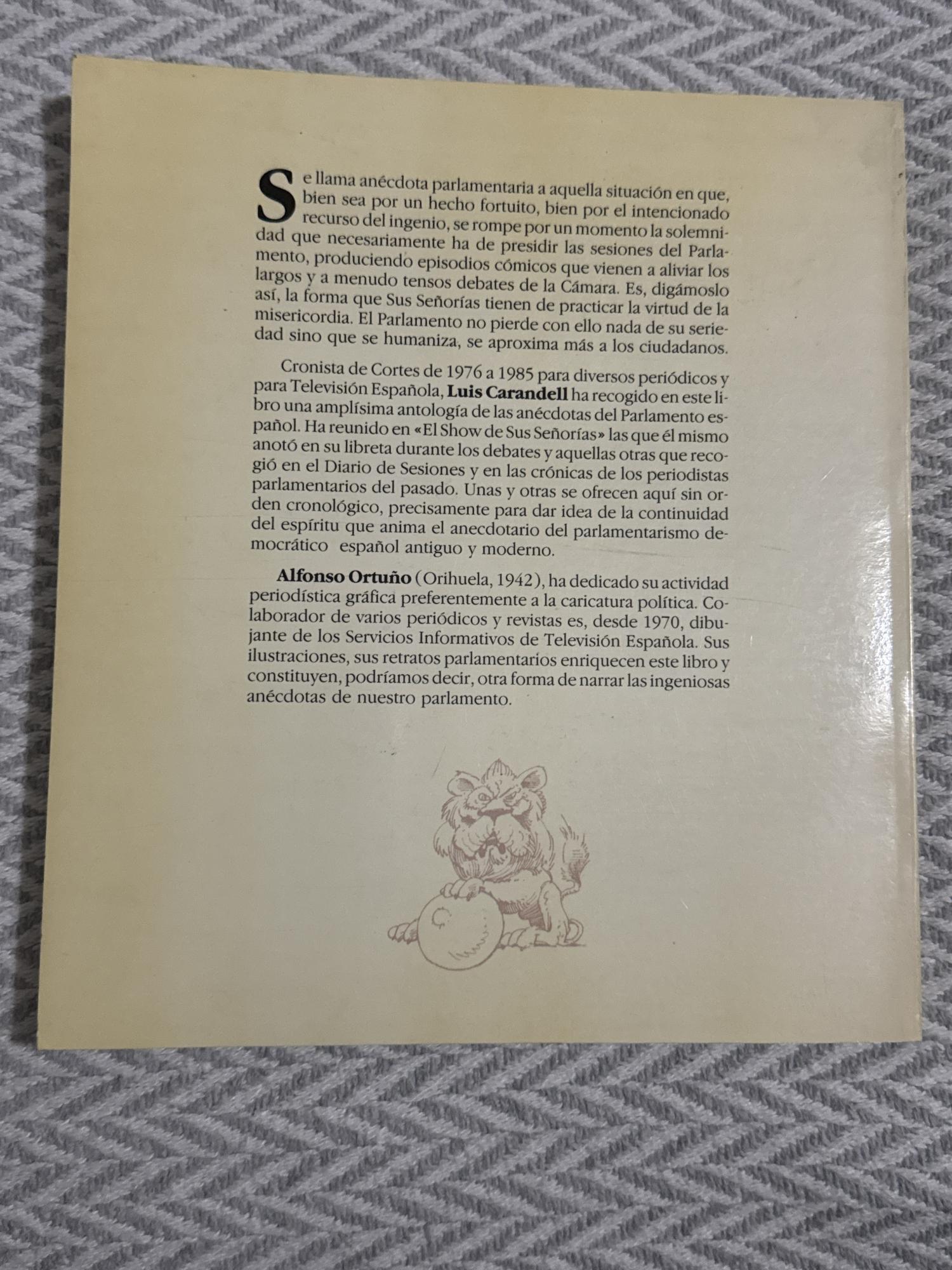 El show de sus señorías de Luis Carandell es una crónica político-periodística que retrata con ironía y mirada crítica la vida parlamentaria española durante la Transición. A través de observaciones directas y comentarios mordaces, el autor muestra los usos, discursos y actitudes de los diputados, convirtiendo el Parlamento en un escenario donde política y espectáculo se entrelazan.
