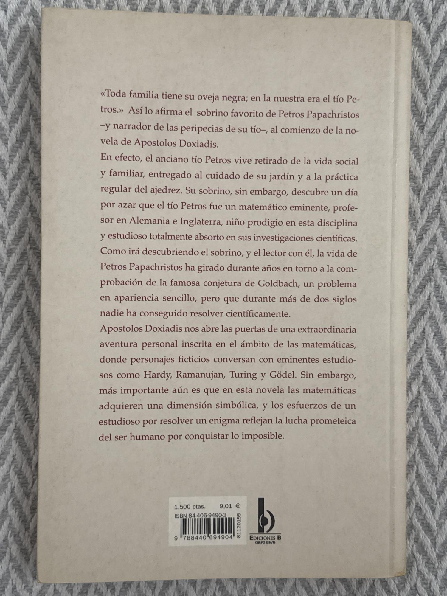 La novela narra la vida de un brillante matemático obsesionado con demostrar la conjetura de Goldbach, explorando el coste personal de la dedicación absoluta a un problema irresuelto. A través de la mirada de su sobrino, se combinan elementos de ficción con ideas matemáticas reales. Es una obra que reflexiona sobre la pasión, el fracaso y la naturaleza de la investigación matemática.