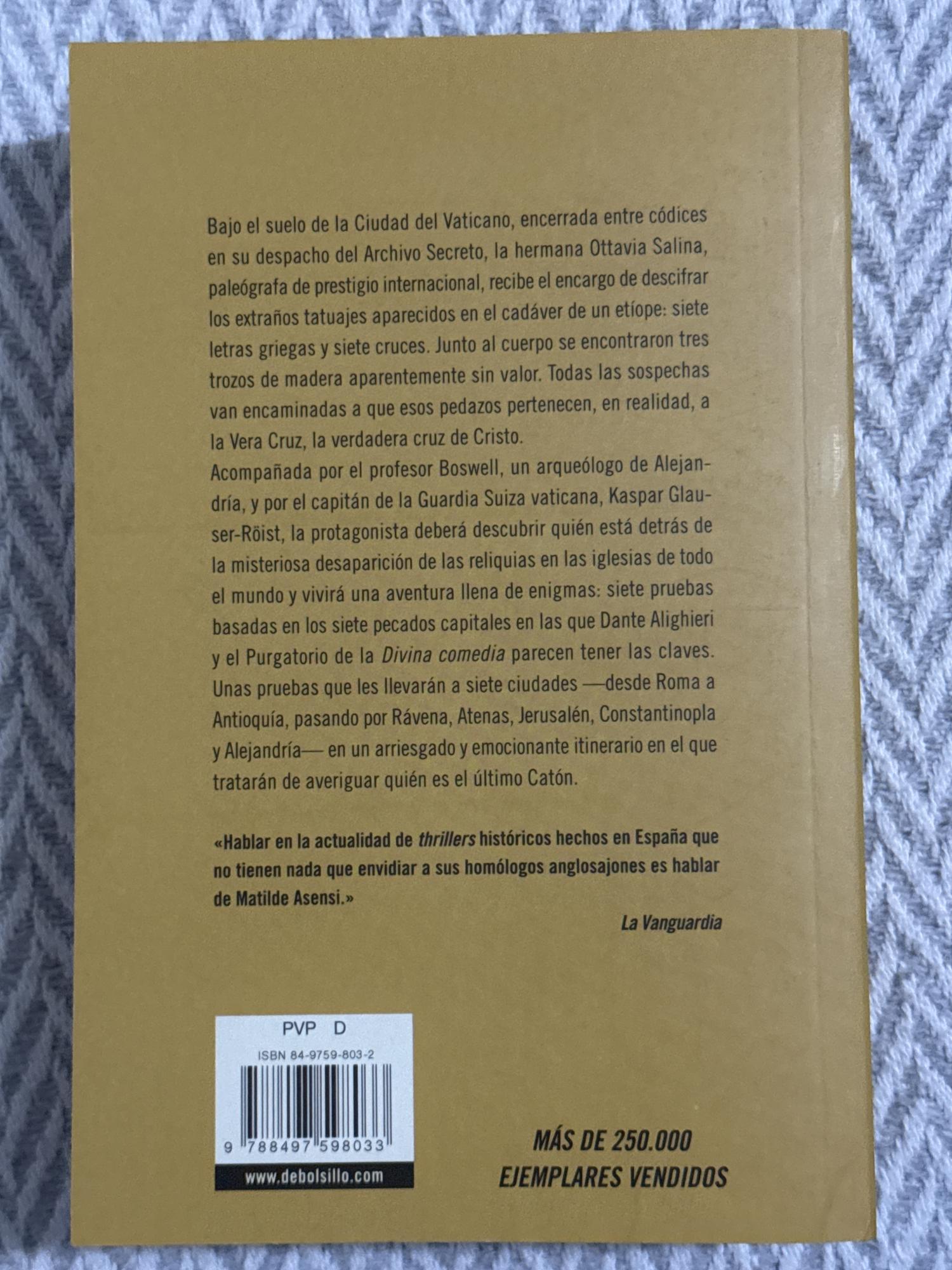 El último Catón de Matilde Asensi es una novela de intriga histórica en la que la hermana Ottavia Salina, experta del Archivo Secreto Vaticano, debe descifrar enigmas basados en La Divina Comedia para recuperar reliquias robadas y enfrentar una conspiración de alcance mundial. La trama combina misterio, acción y referencias culturales y religiosas en un ritmo ágil y envolvente.