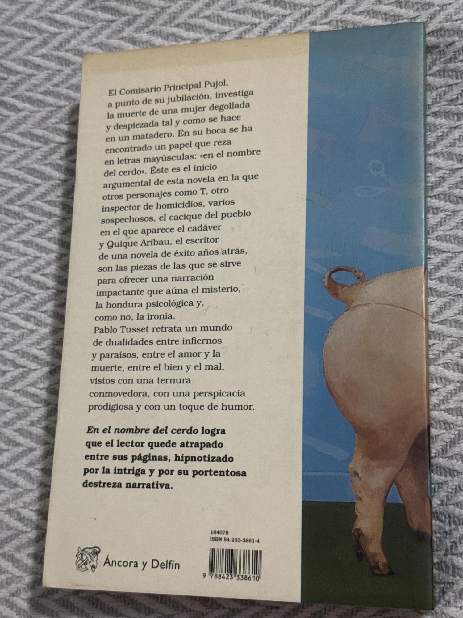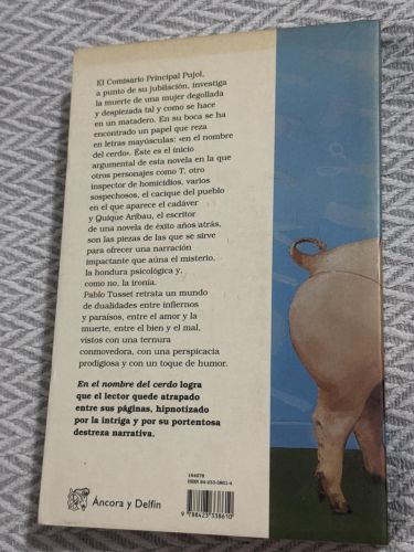 En el nombre del cerdo es una novela que combina intriga, humor y crítica social. El Comisario Principal Pujol, al borde de su jubilación, debe investigar el brutal asesinato de una mujer, degollada y despiezada como en un matadero. En su boca se encuentra un inquietante mensaje escrito en mayúsculas: "EN EL NOMBRE DEL CERDO". Una trama absorbente que engancha desde la primera página con su tono singular e inteligente.