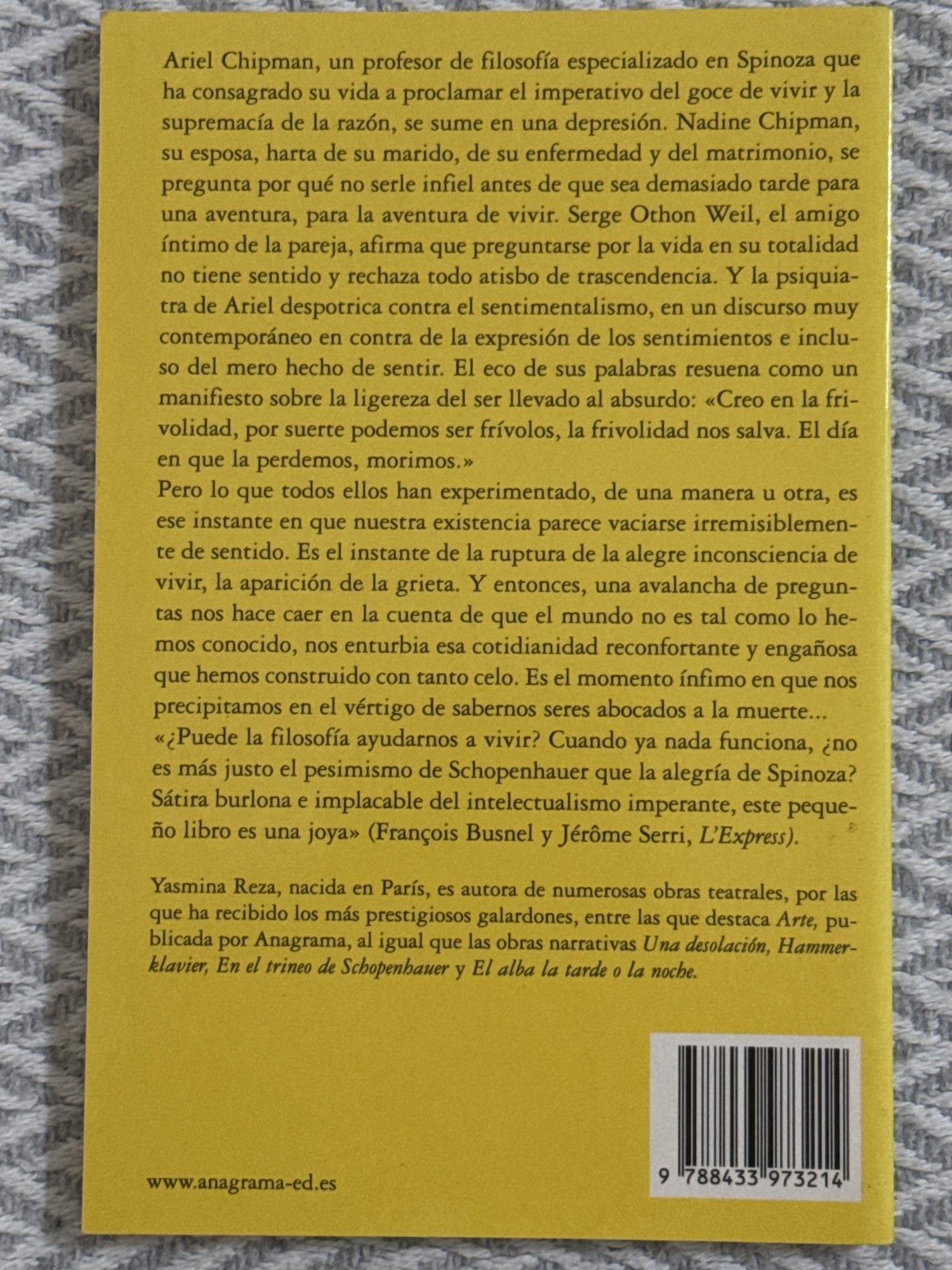 Ariel Chipman, profesor de filosofía, atraviesa una depresión profunda pese a haber predicado siempre el valor del disfrute de la vida. Su esposa Nadine contempla la posibilidad de serle infiel, mientras su amigo Serge rechaza toda búsqueda de sentido trascendente. La novela despliega un momento de crisis existencial donde los personajes confrontan el vacío, las expectativas y la fragilidad de la existencia.