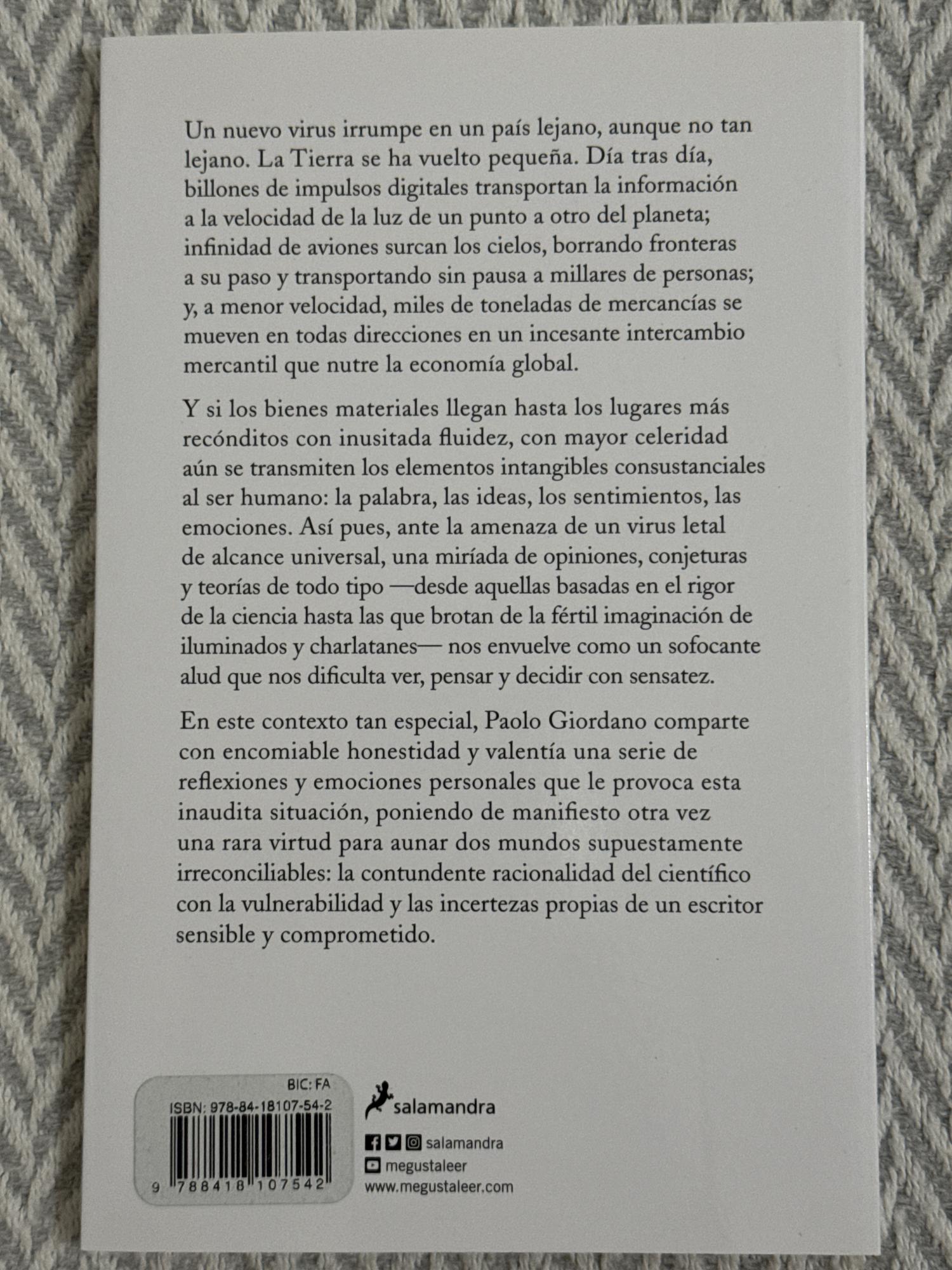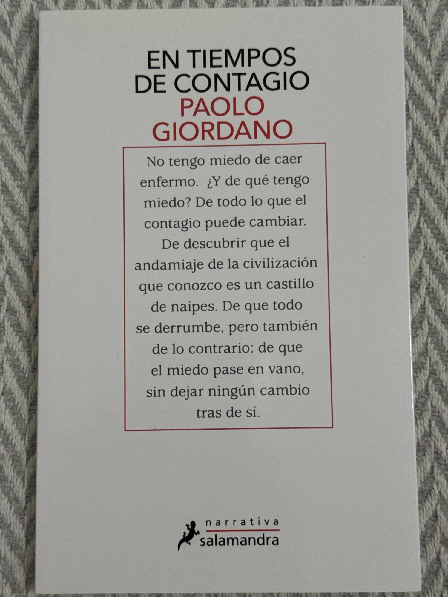 En tiempos de contagio es un ensayo breve escrito durante la crisis del COVID-19 en el que Paolo Giordano reflexiona sobre el significado del contagio más allá de lo biológico, y cómo lo social, lo emocional y lo comunicativo también se propagan en situaciones de crisis.