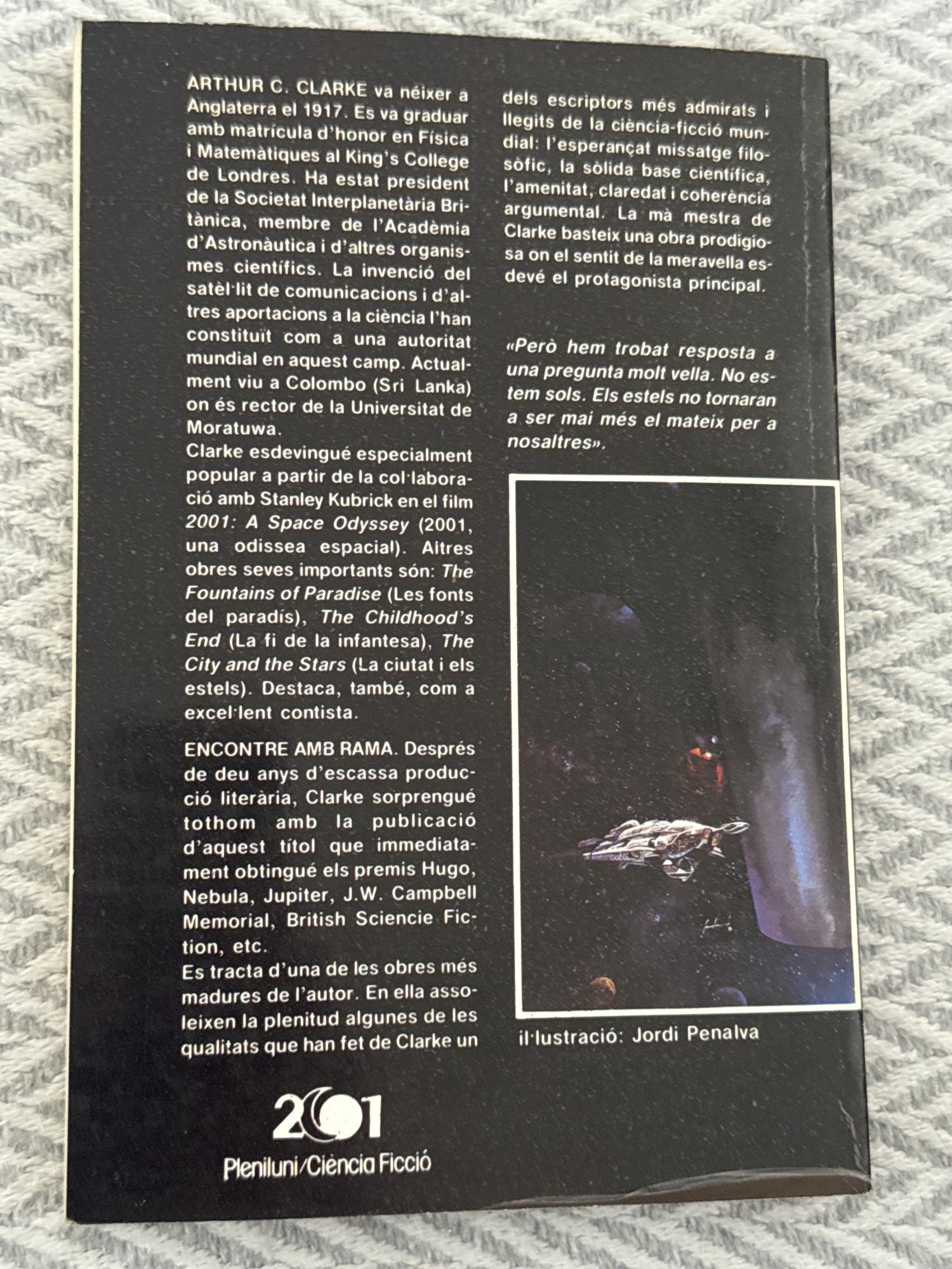 Encontre amb Rama (Rendezvous with Rama), de Arthur C. Clarke, narra l’arribada d’un misteriós objecte cilíndric extraterrestre al sistema solar i la missió d’un equip d’exploradors humans per investigar-lo. La novel·la explora el misteri, el descobriment i els límits del coneixement humà davant una intel·ligència desconeguda.