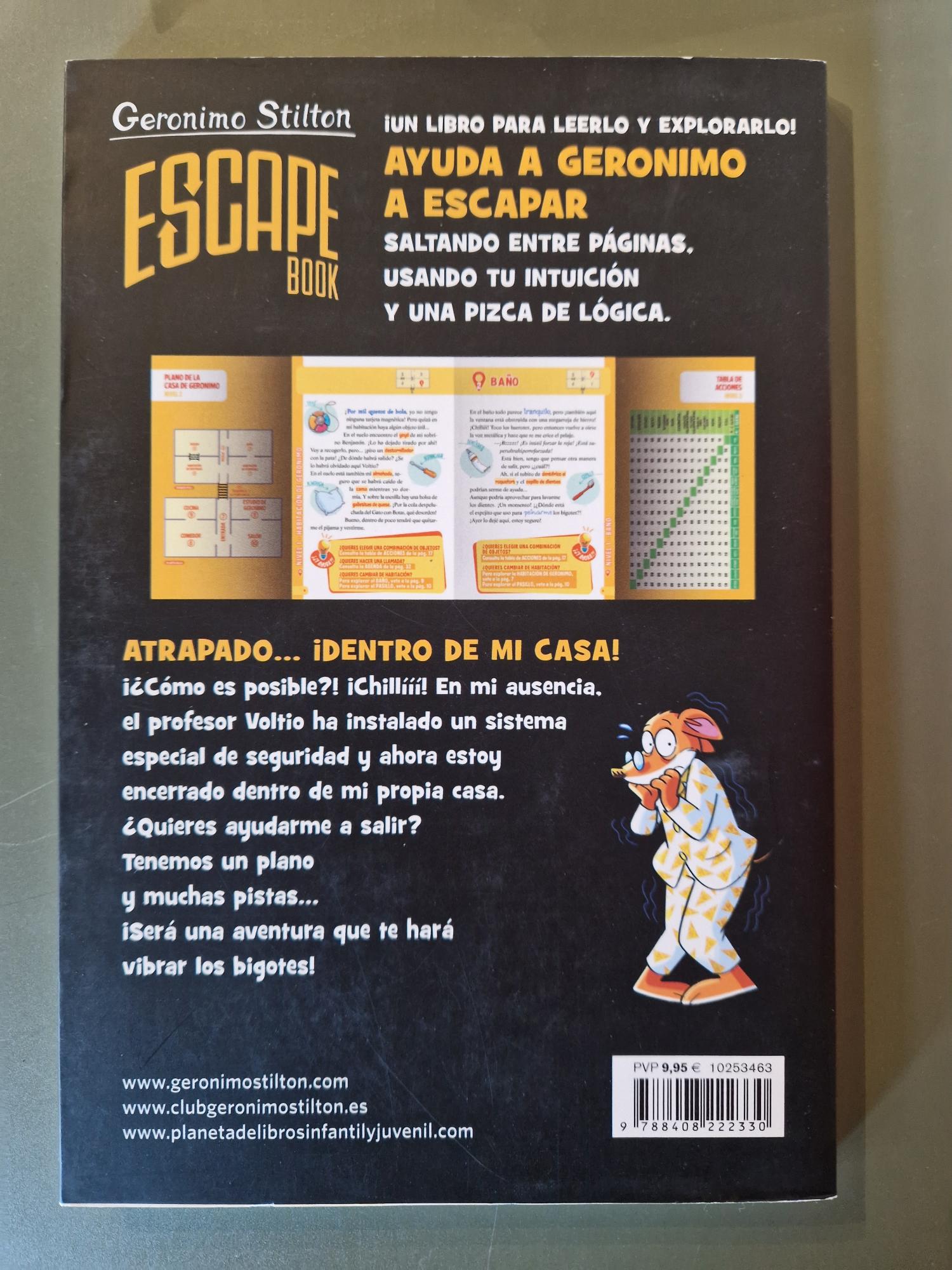 En Escape Book. Atrapado… ¡dentro de mi casa!, Geronimo Stilton se enfrenta a una aventura trepidante llena de enigmas, acertijos y sorpresas. El lector deberá ayudarle a resolver pruebas y tomar decisiones para conseguir escapar, convirtiéndose en protagonista activo de la historia. Con humor, misterio y participación directa, este libro ofrece una experiencia de lectura interactiva tan divertida como desafiante.