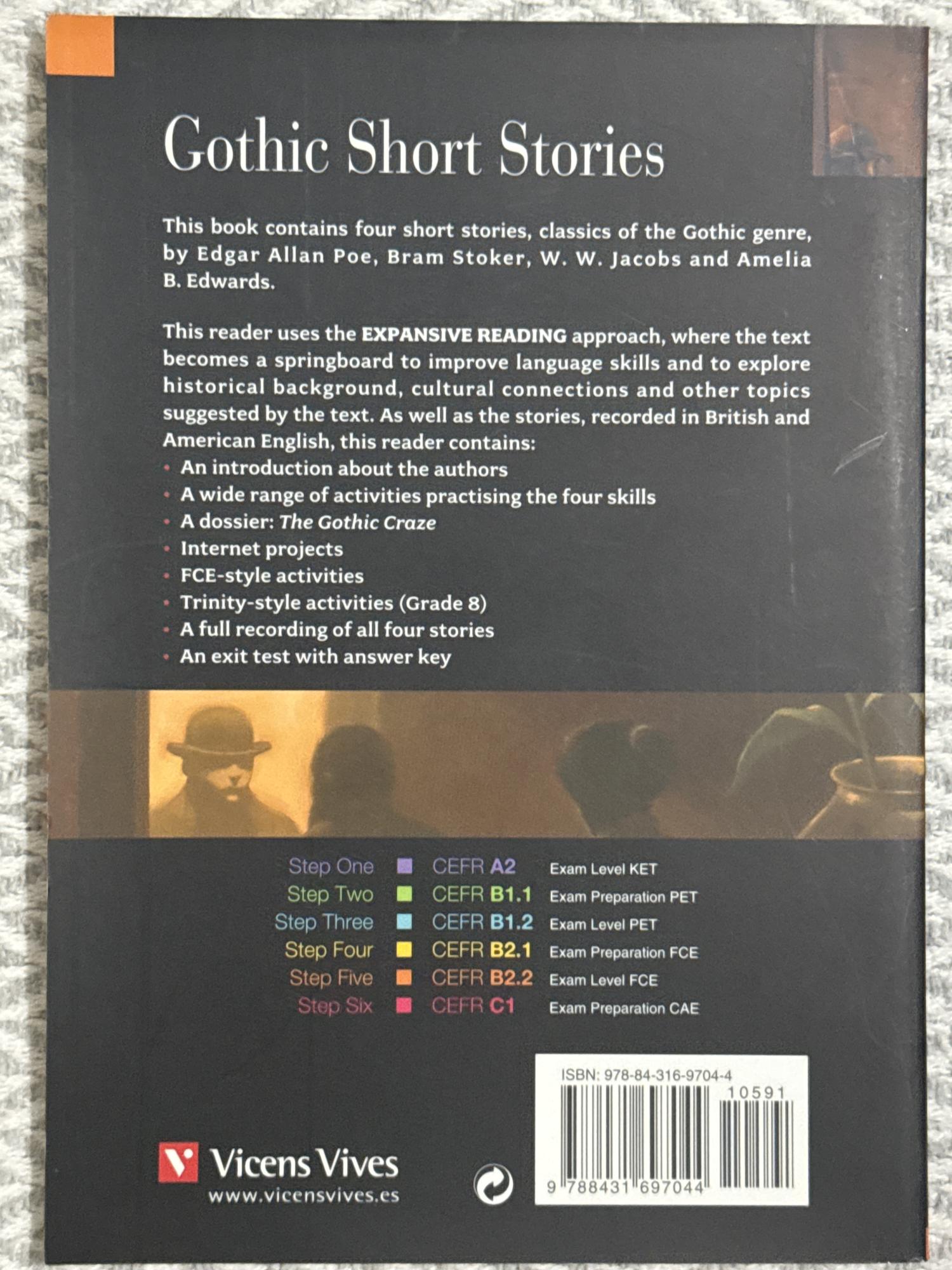 Gothic Short Stories reúne cuatro relatos clásicos del género gótico: “The Monkey’s Paw” de W. W. Jacobs, “The Phantom Coach” de Amelia B. Edwards, “The Fall of the House of Usher” de Edgar Allan Poe y “The Judge’s House” de Bram Stoker. Adaptado para el nivel B2 de inglés, el libro combina lenguaje accesible con notas y actividades que ayudan a mejorar la comprensión lectora y ampliar el vocabulario.