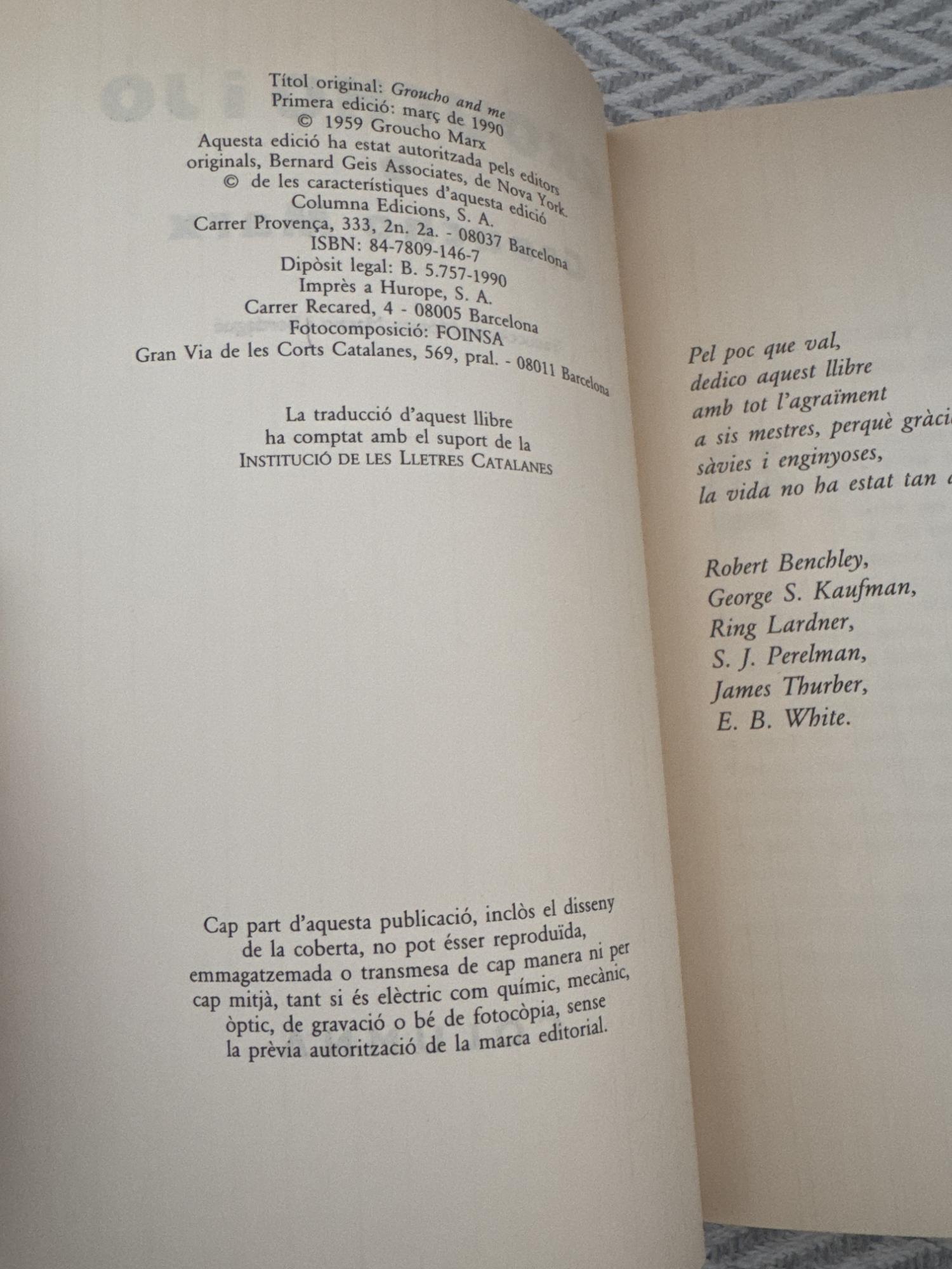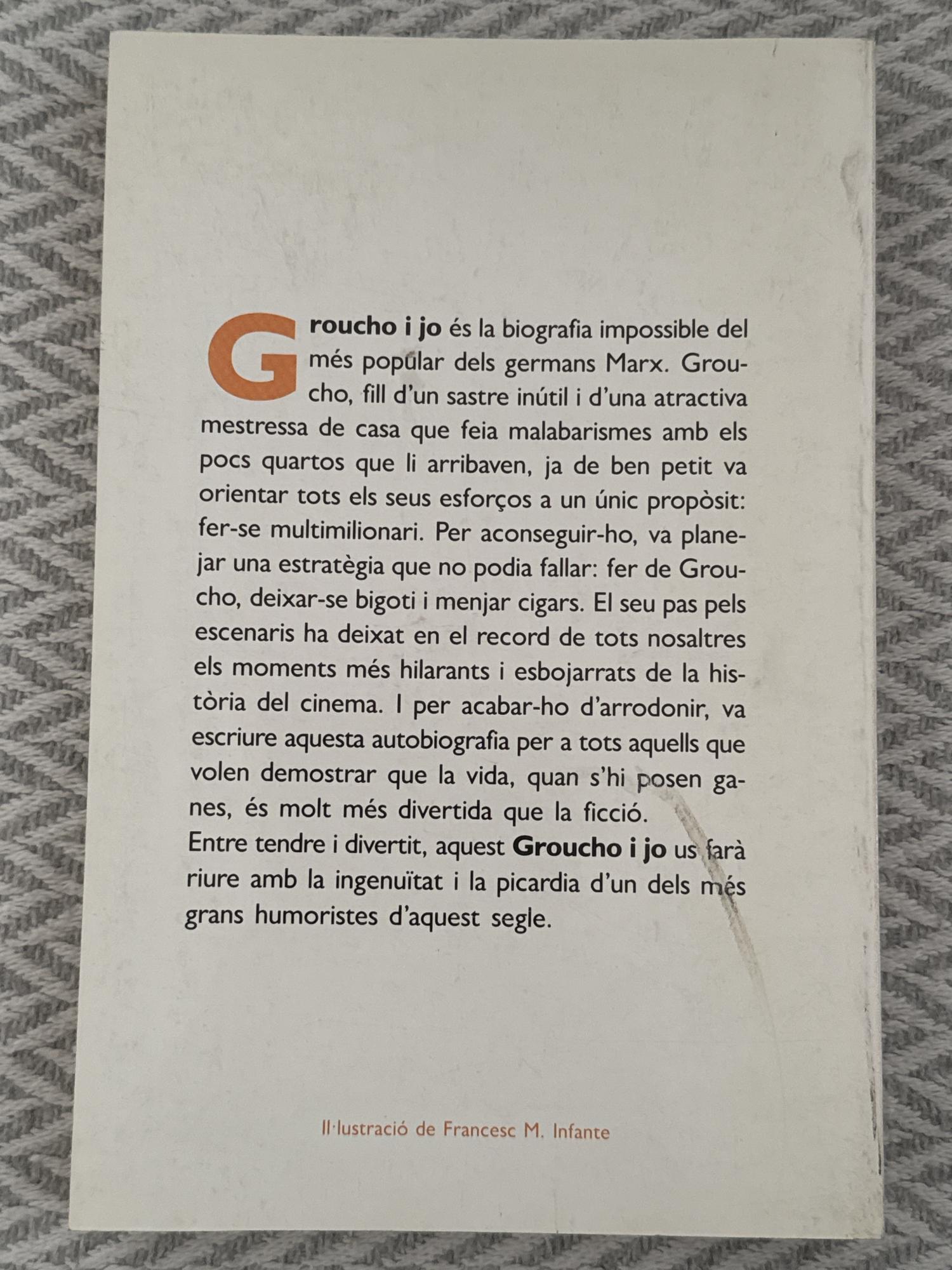 Groucho i jo de Groucho Marx és una obra autobiogràfica escrita amb el seu característic humor irreverent i sarcàstic. El llibre combina records personals, anècdotes de la carrera artística i reflexions iròniques sobre el cinema, l’espectacle i la vida pública, oferint una mirada divertida i desmitificadora sobre l’època daurada de Hollywood.